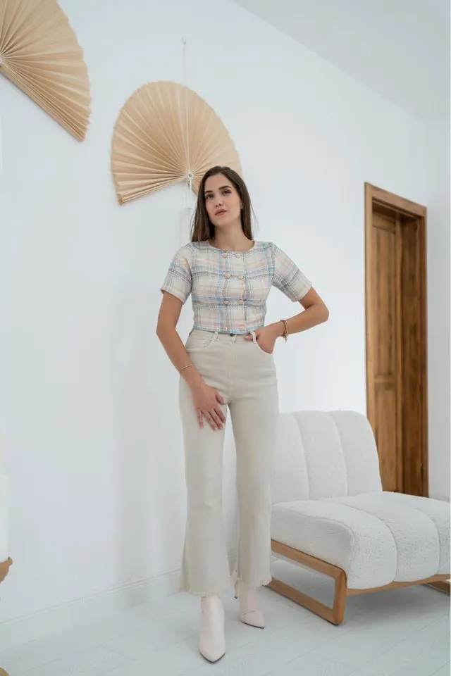 الموديل ترتدي مقاس SM – الطول 172 سم، الوزن 65 كغ، الصدر 85 سم، الخصر 66 سم، الورك 93 سم