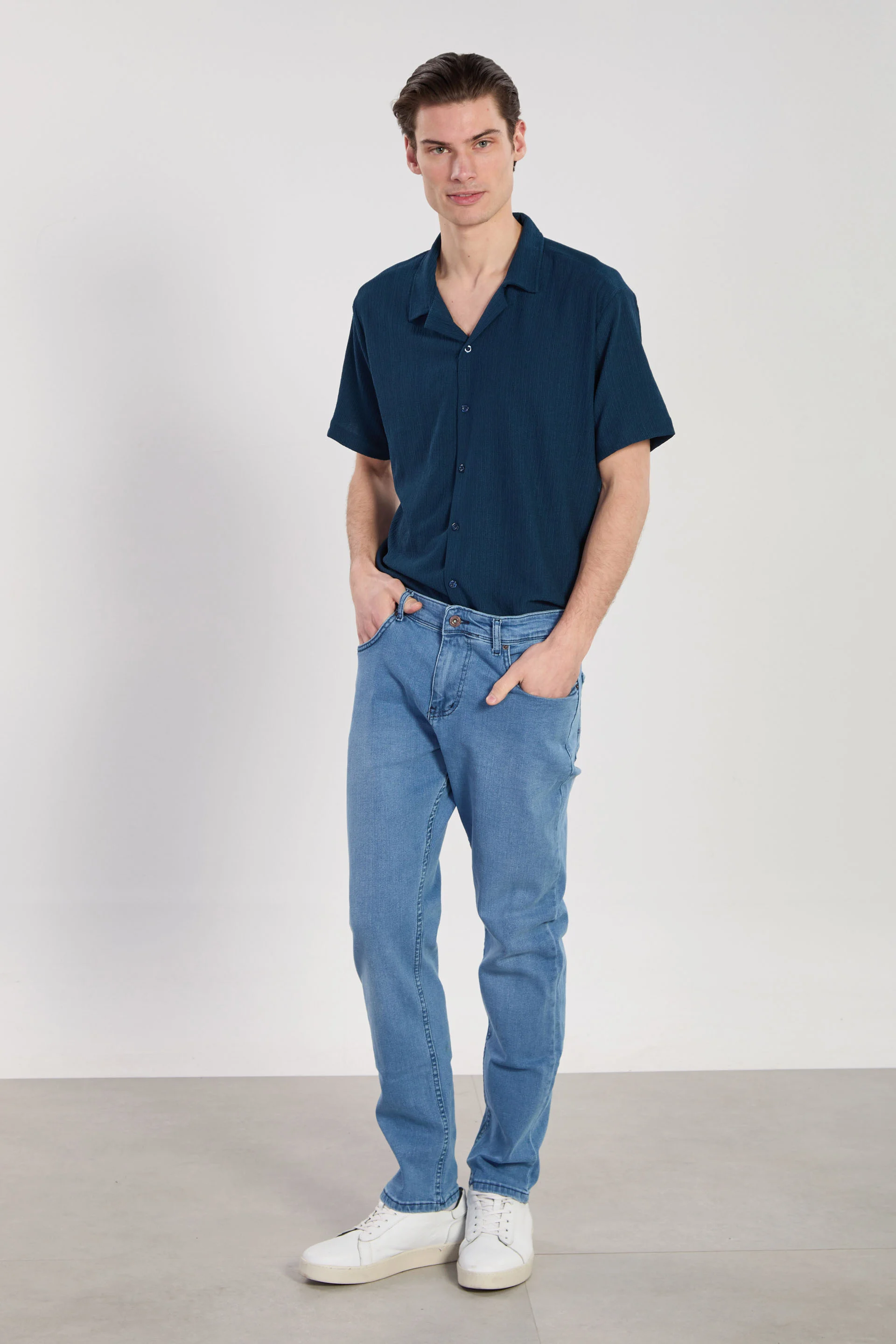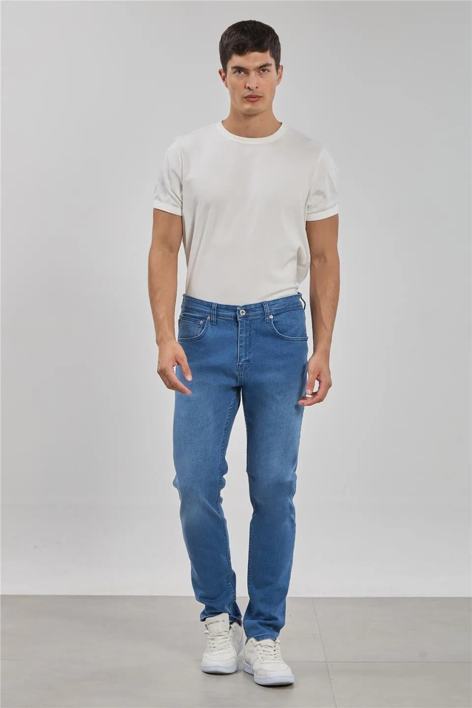 بنطال جينز رجالي بقصة فضفاضة، وخصر مطاطي، ورباط. مصمم لسهولة الارتداء والتنسيق اليومي، يوفر المرونة وحرية الحركة ومظهرًا عصريًا أنيقًا.