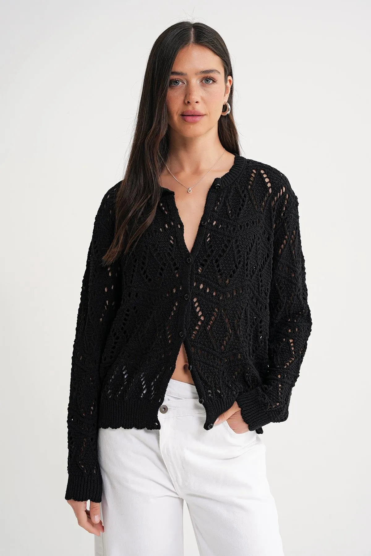 كارديغان تريكو مريح بنقشة جلد الفهد وياقة دائرية مع أزرار أمامية يمنحك ستايل يومي شتوي دافئ.