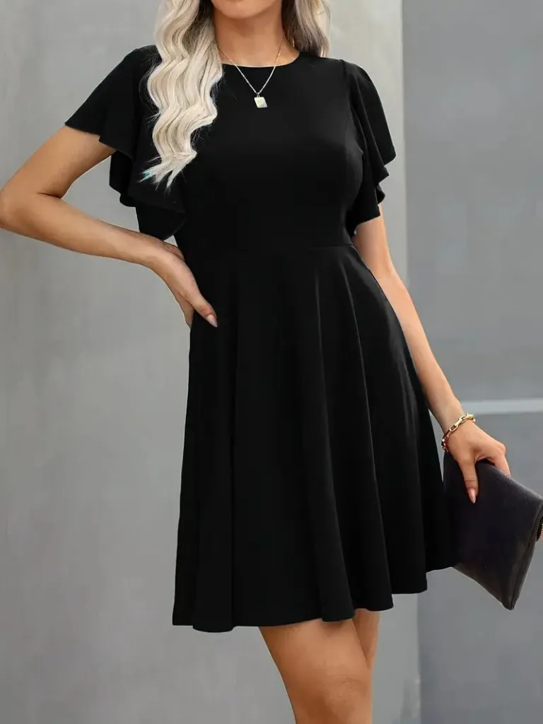فستان نسائي وافل قصير بياقة V دانتيل وكتف مكشوف بقصة محددة وملمس محبب مريح يعطي ستايل شيك ولوك يومي انثوي وخفيف