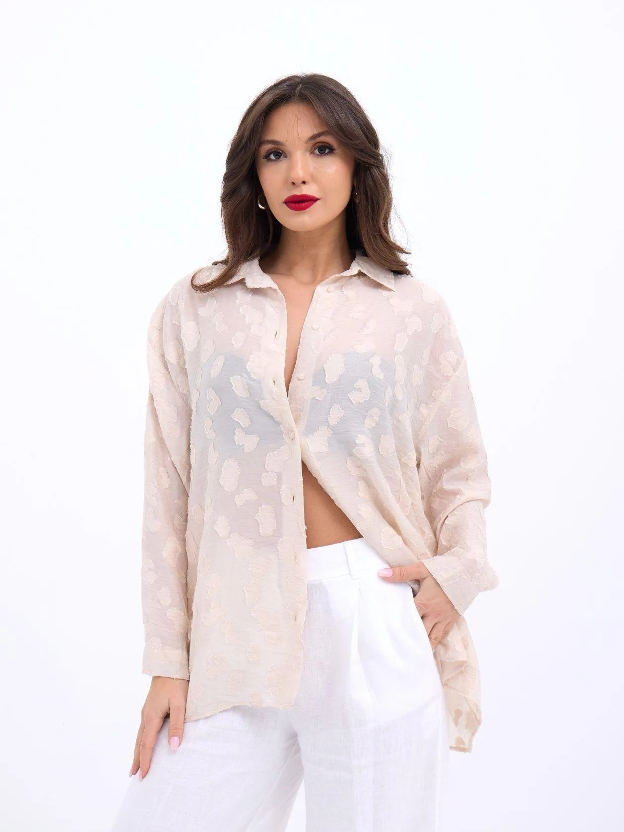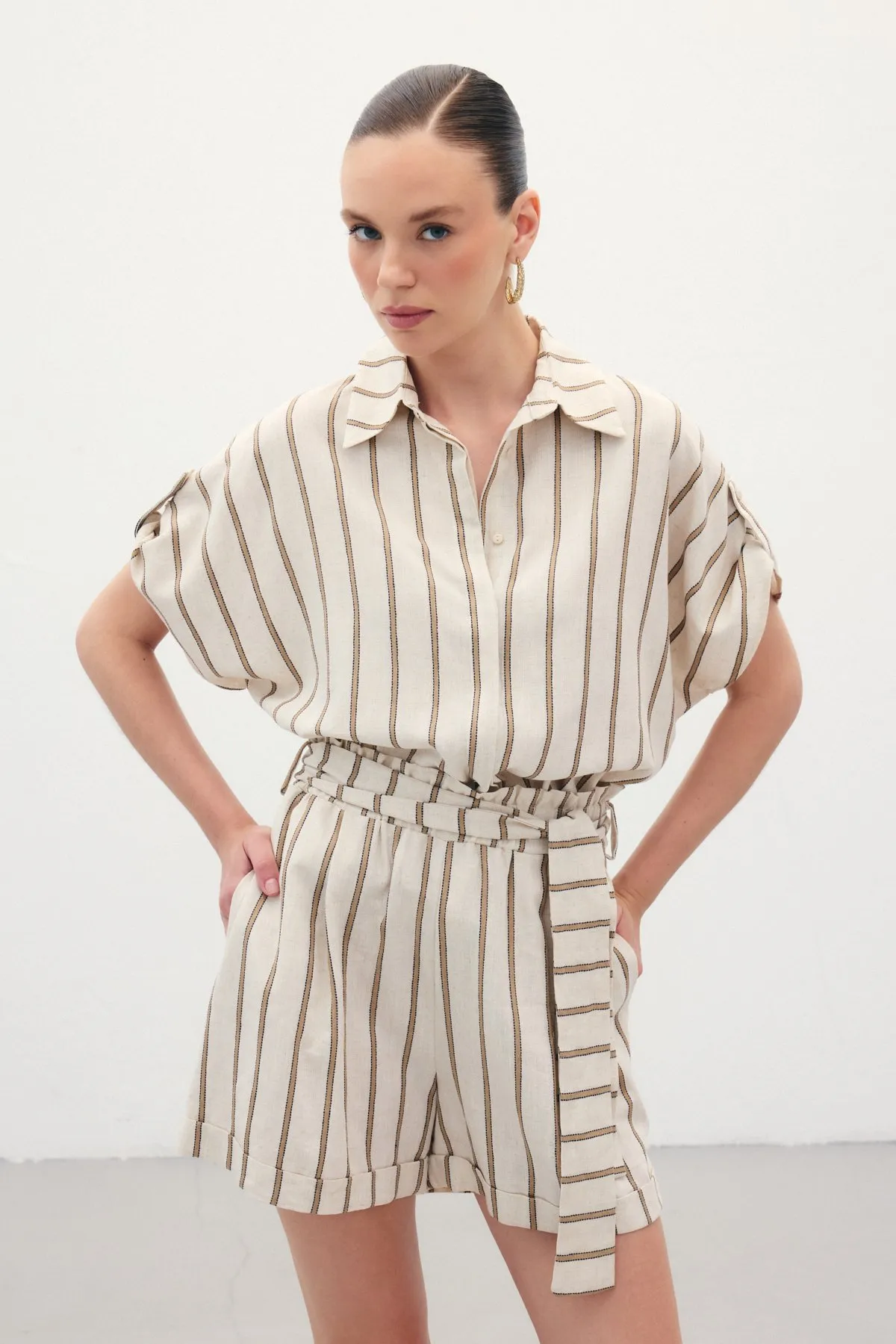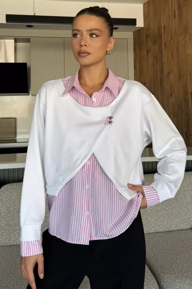 قميص نسائي مخطط خفيف بكم طويل مع جيب امامي وقصة عادية لستايل يومي شيك وسهل التنسيق.