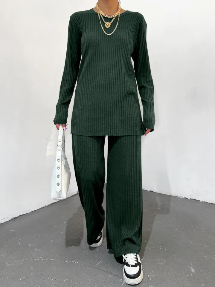 طقم نسائي مكوّن من بلوزة بأكمام طويلة مع فتحة على كتف واحدة وبنطلون متناسق، مصنوع من قماش ناعم وقابل للتهوية يوفر راحة وسهولة في الحركة. تصميم بياقة على شكل حرف V عصري وأنيق، مثالي للإطلالات الكاجوال أو شبه الرسمية، مناسب لجميع الفصول.