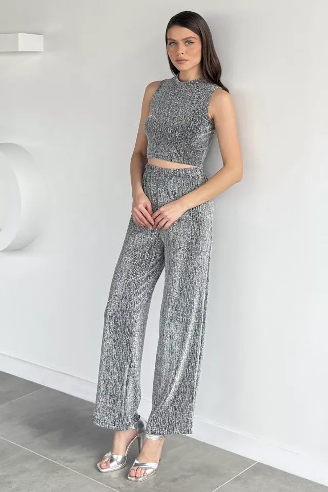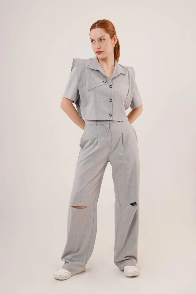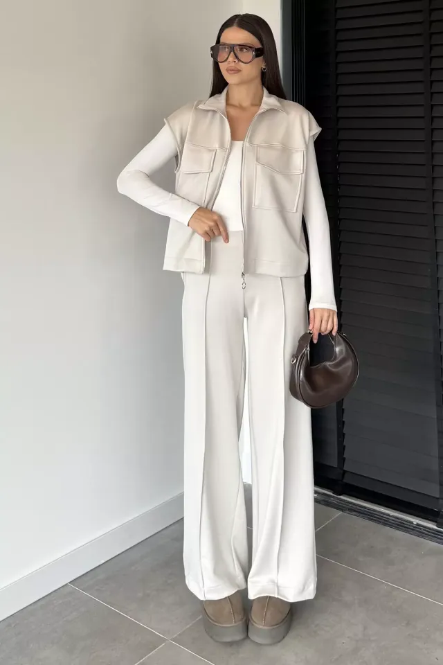 طقم نسائي أنيق مكون من ثلاث قطع جاكيت مفتوح من الأمام بأكمام طويلة، بلوزة بدون أكمام، وبنطلون متناسق بنقشة زهور ناعمة. مصنوع من قماش خفيف وناعم، مريح وسهل التنسيق، مثالي للإطلالات اليومية الأنيقة والكاجوال الراقي.