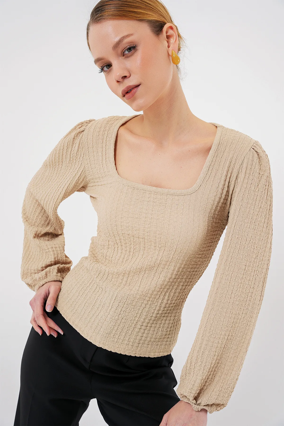 بلوزة نسائية بأكمام طويلة وياقة عالية مزينة بتفاصيل دانتيل دقيقة، مع قصة جذابة تمنح إطلالة أنيقة وعصرية. مصنوعة من قماش محبوك ناعم وقابل للتنفس، مناسبة لجميع الفصول، وسهلة الغسيل بالغسالة.