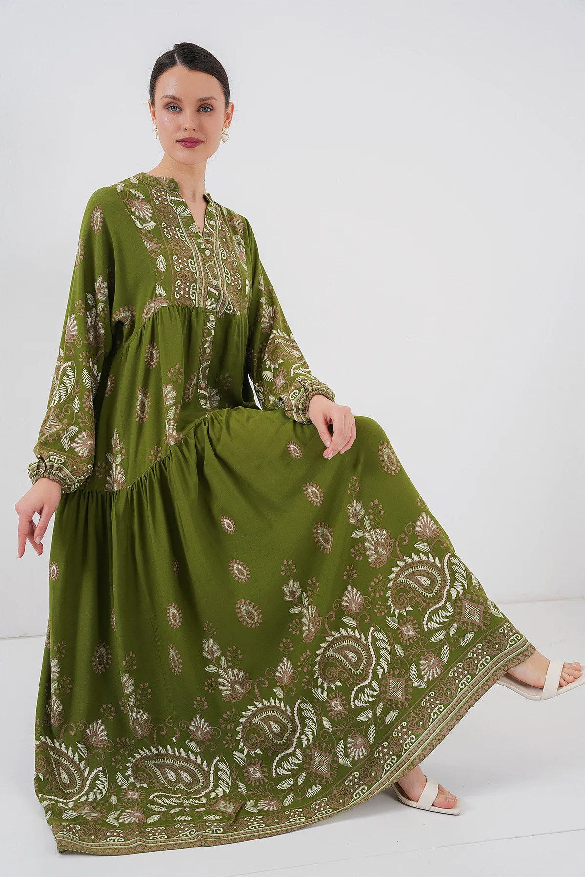 فستان طويل بقصة A وياقة قائمة بتفاصيل حجر واكمام واسعة مزمومة مع حزام للنساء