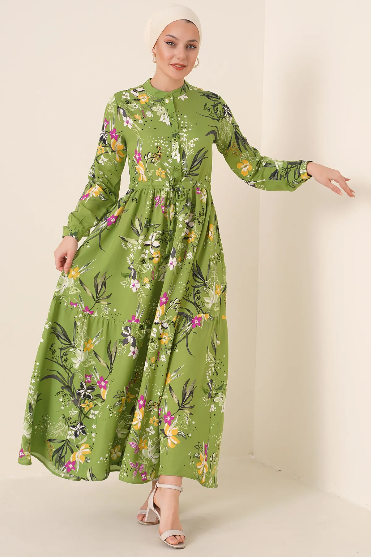 فستان طويل بقصة A وطيات وياقة قائمة واكمام واسعة من قماش كريب