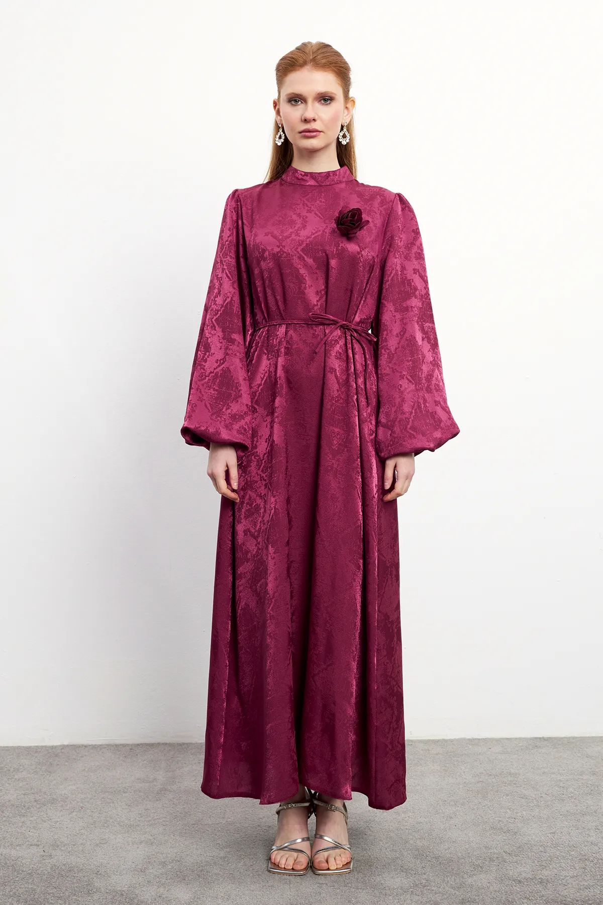 فستان طويل بقماش كريب بنسيج ذاتي وياقة قائمة واكمام واسعة مع طيات وقصة A وحزام خصر يمنحك لوك محتشم وانيق.