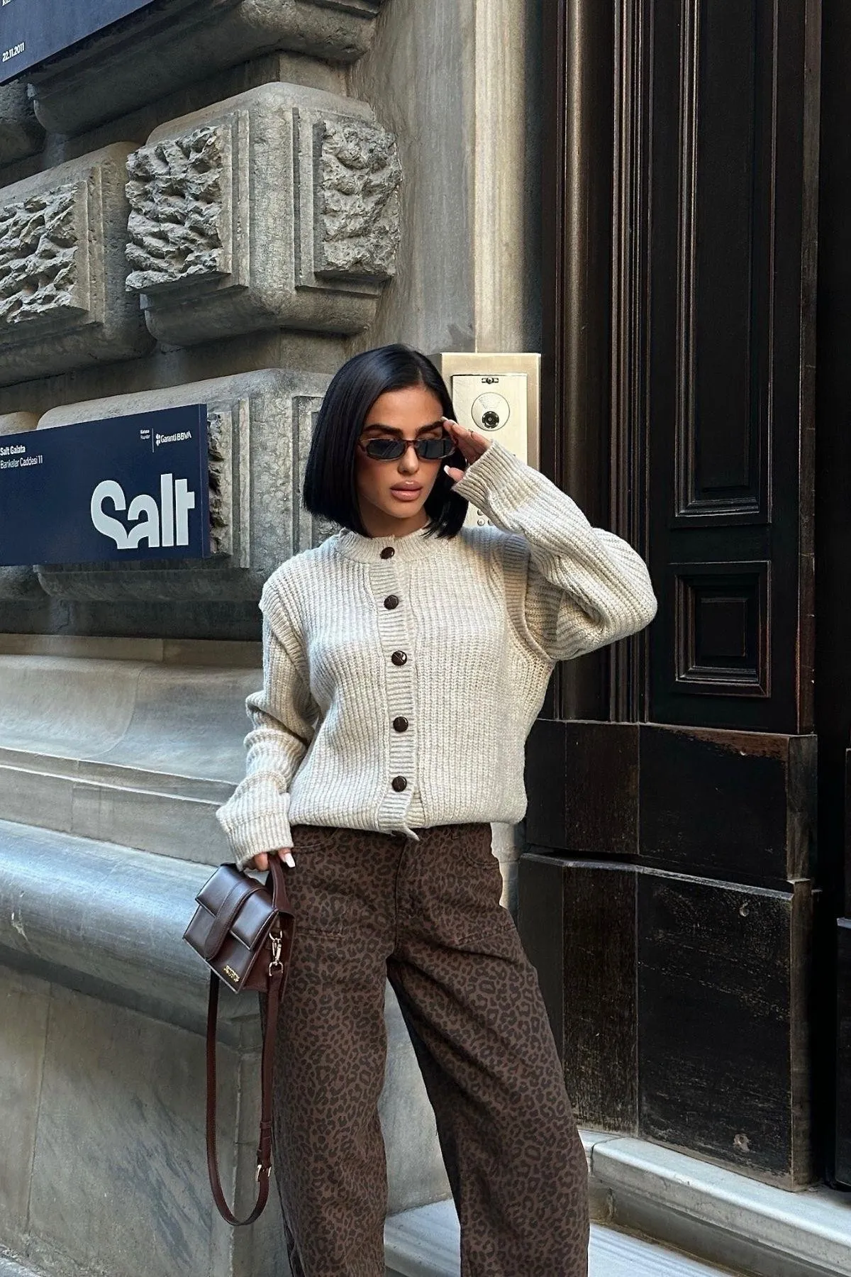 الموديل ترتدي مقاس S – الطول 172 سم، الوزن 65 كغ، الصدر 85 سم، الخصر 66 سم، الورك 93 سم