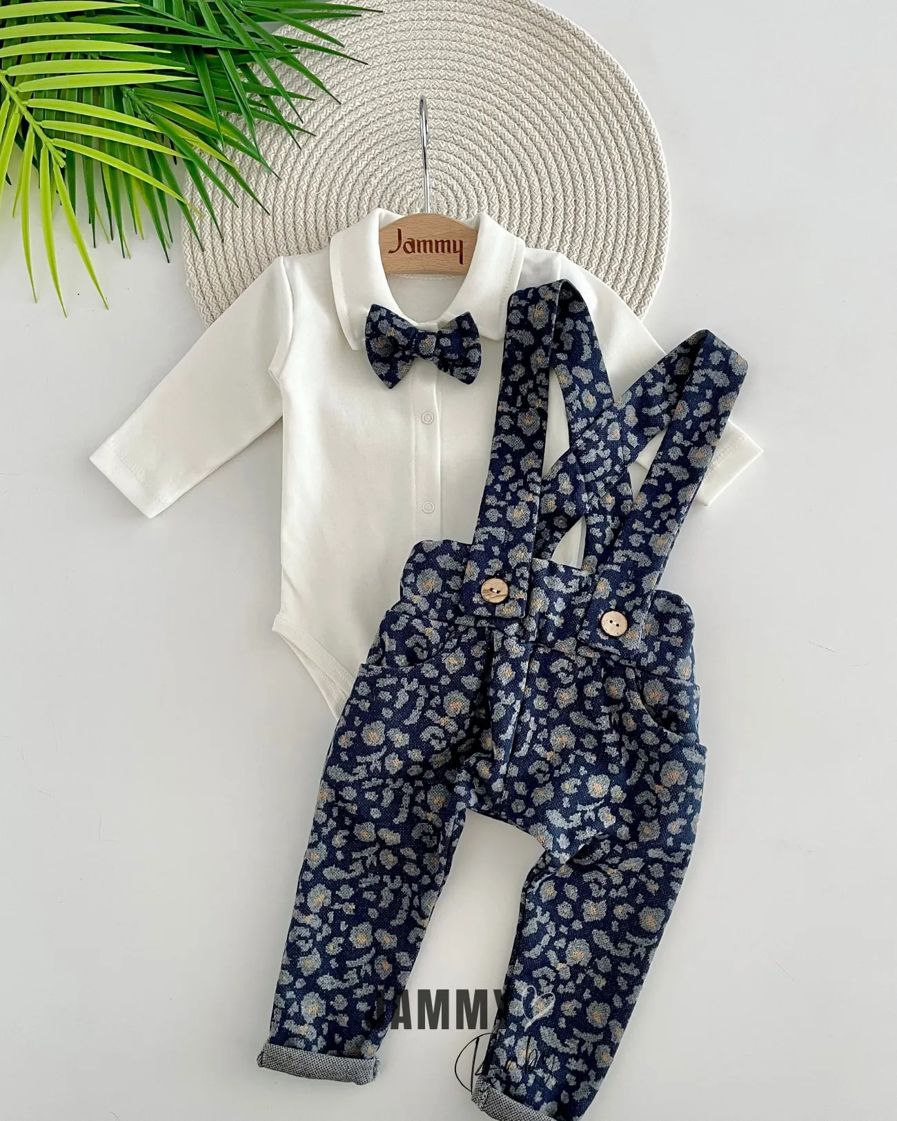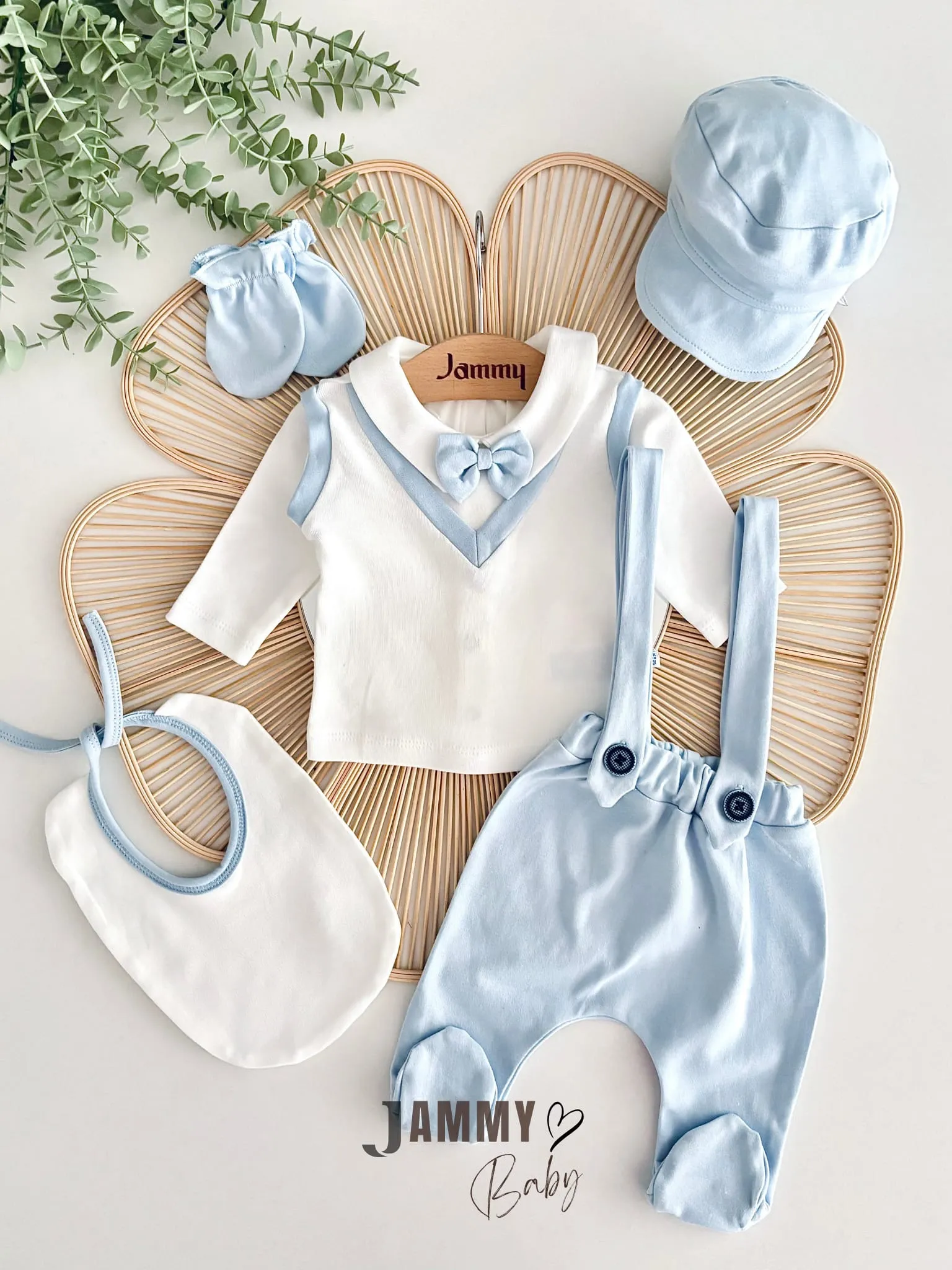 طقم مواليد أولادي مكون من 5 قطع بتصميم لطيف مزين بتطريز دب مع أفرول بحمالات عملية. مصنوع من قماش ناعم ولطيف على بشرة الطفل، يوفر الراحة والتهوية، مناسب لمستشفى الولادة والاستخدام اليومي.