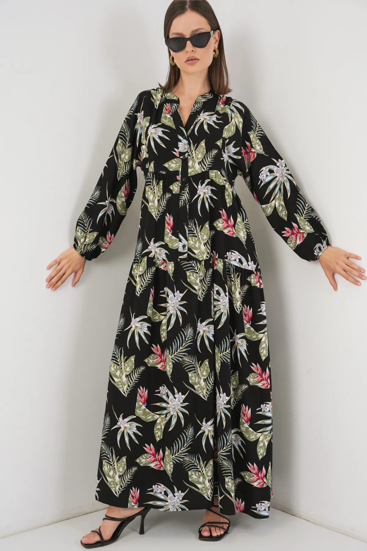 فستان نسائي طويل بقصة A وياقة قائمة واكمام واسعة مزمومة بنقشة جلد الفهد - Beyond Store