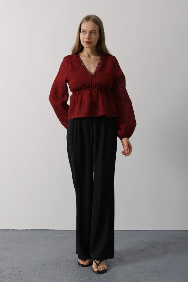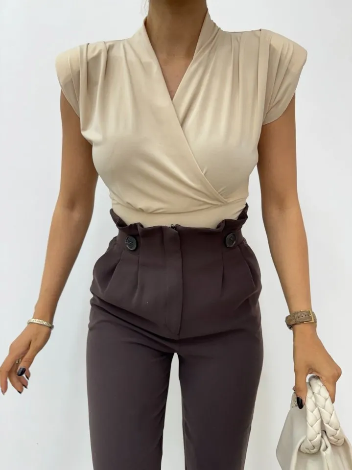 بلوزة نسائية بأكمام طويلة وتصميم مزدوج الصدر مع ياقة أنفيلوب تضيف لمسة أنيقة وعصرية. مصنوعة من قماش ساندي ناعم ومريح، سهلة التنسيق مع مختلف القطع، مناسبة للإطلالات اليومية والكاجوال الأنيق والمناسبات الخفيفة.