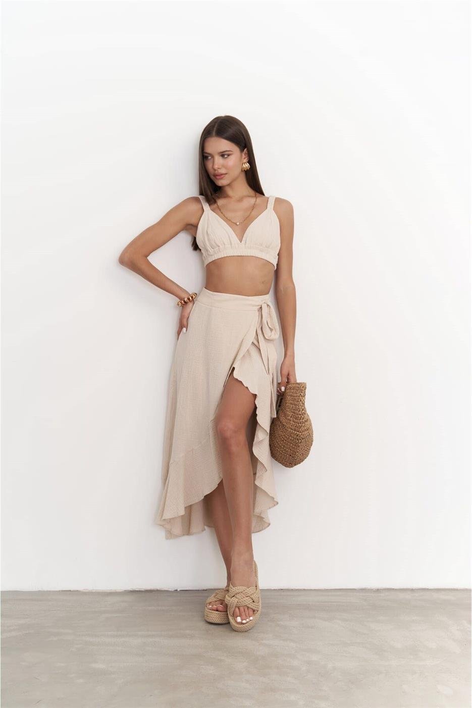 طقم كيمونو وتنورة طويل مريح بياقة V وكم طويل وتفاصيل اربطة لستايل يومي خفيف ولوك صيفي شيك.
