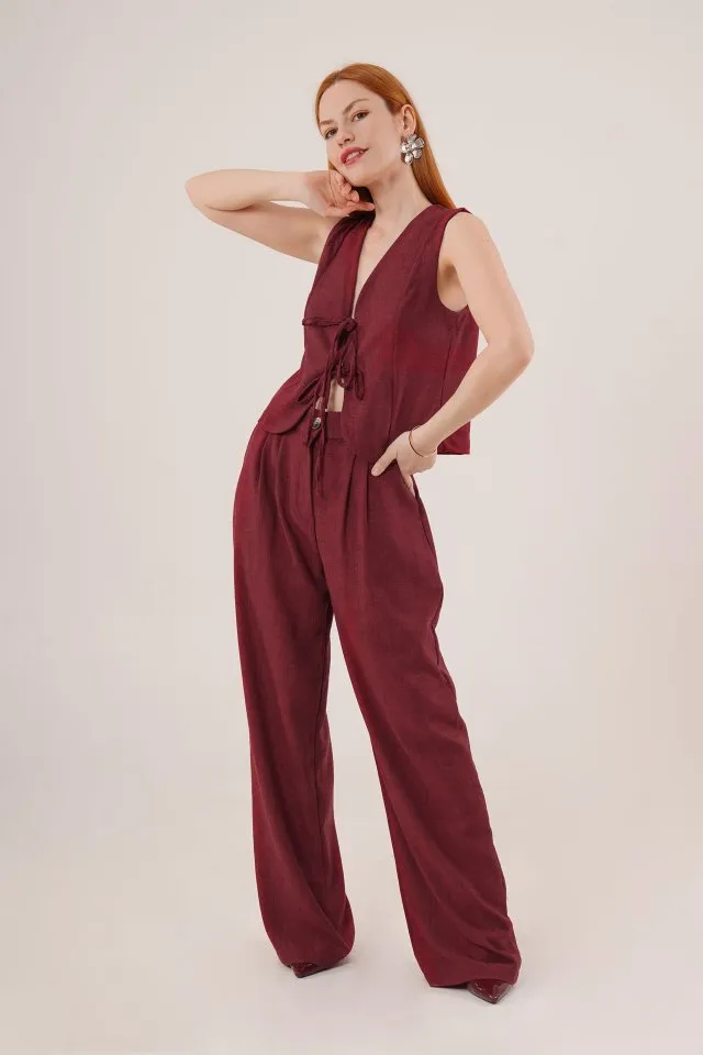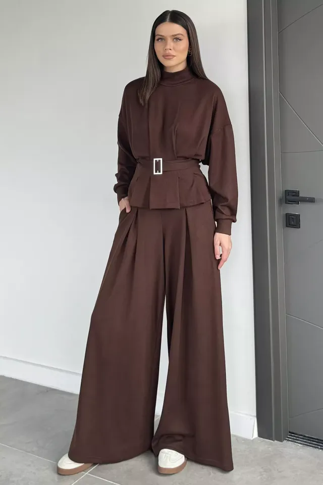 طقم نسائي مكون من كيمونو محبوك وبنطلون بنمط لف مع تفاصيل كشكشة أنيقة تضيف لمسة أنثوية عصرية. مصنوع من قماش ناعم ومريح، سهل التنسيق، مثالي للإطلالات اليومية والكاجوال الأنيق.