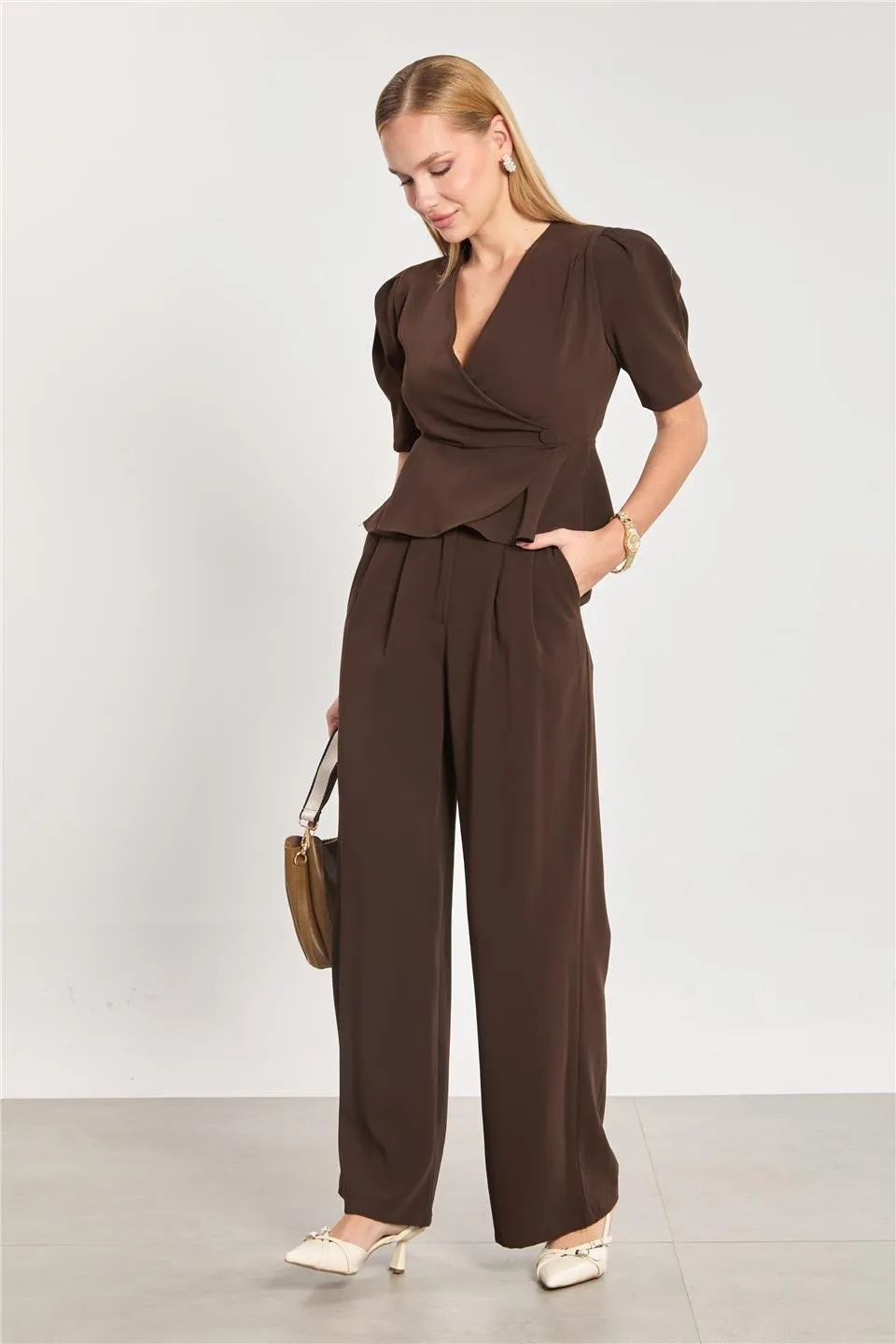 طقم نسائي مكون من كيمونو محبوك وبنطلون بنمط لف مع تفاصيل كشكشة أنيقة تضيف لمسة أنثوية عصرية. مصنوع من قماش ناعم ومريح، سهل التنسيق، مثالي للإطلالات اليومية والكاجوال الأنيق.
