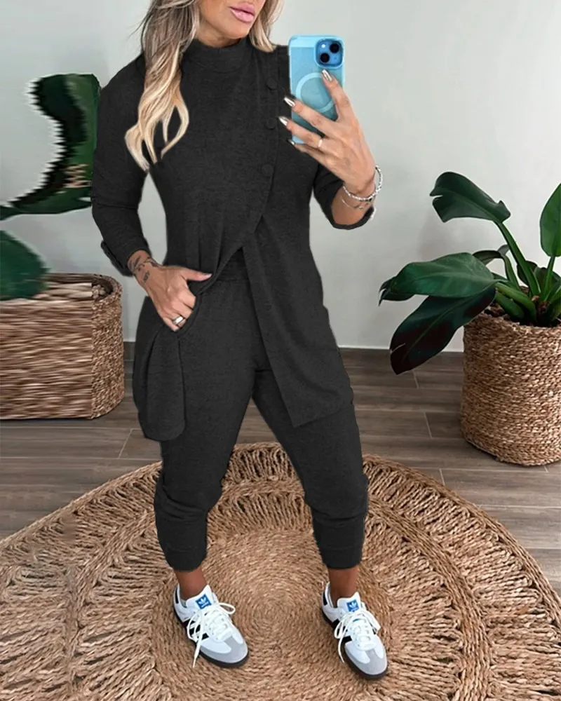 طقم تونيك برباط أمامي و بنطلون واسع الساقين للنساء