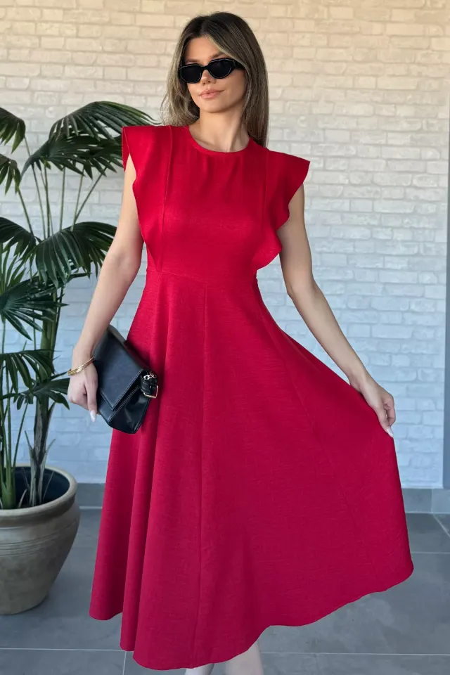 الموديل ترتدي مقاس 38 – الطول 172 سم، الوزن 53 كغ، الصدر 83 سم، الخصر 70 سم، الورك 91 سم