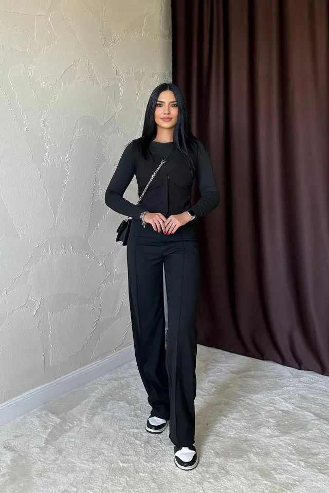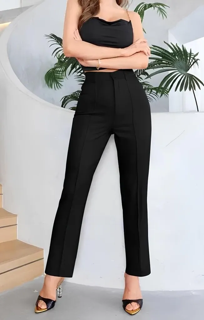 بنطلون خصر عالي مريح بقصة مستقيمة وخصر مرن مع شريط جانبي وجيبين لستايل يومي عملي ولوك كاجوال مريح.