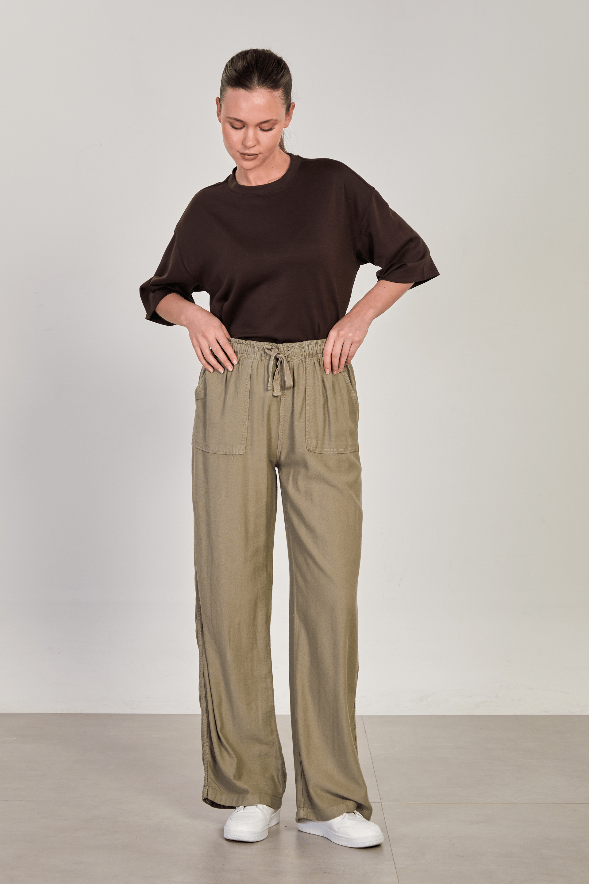 بنطلون خصر عالي مريح بقصة مستقيمة وخصر مرن مع شريط جانبي وجيبين لستايل يومي عملي ولوك كاجوال مريح.