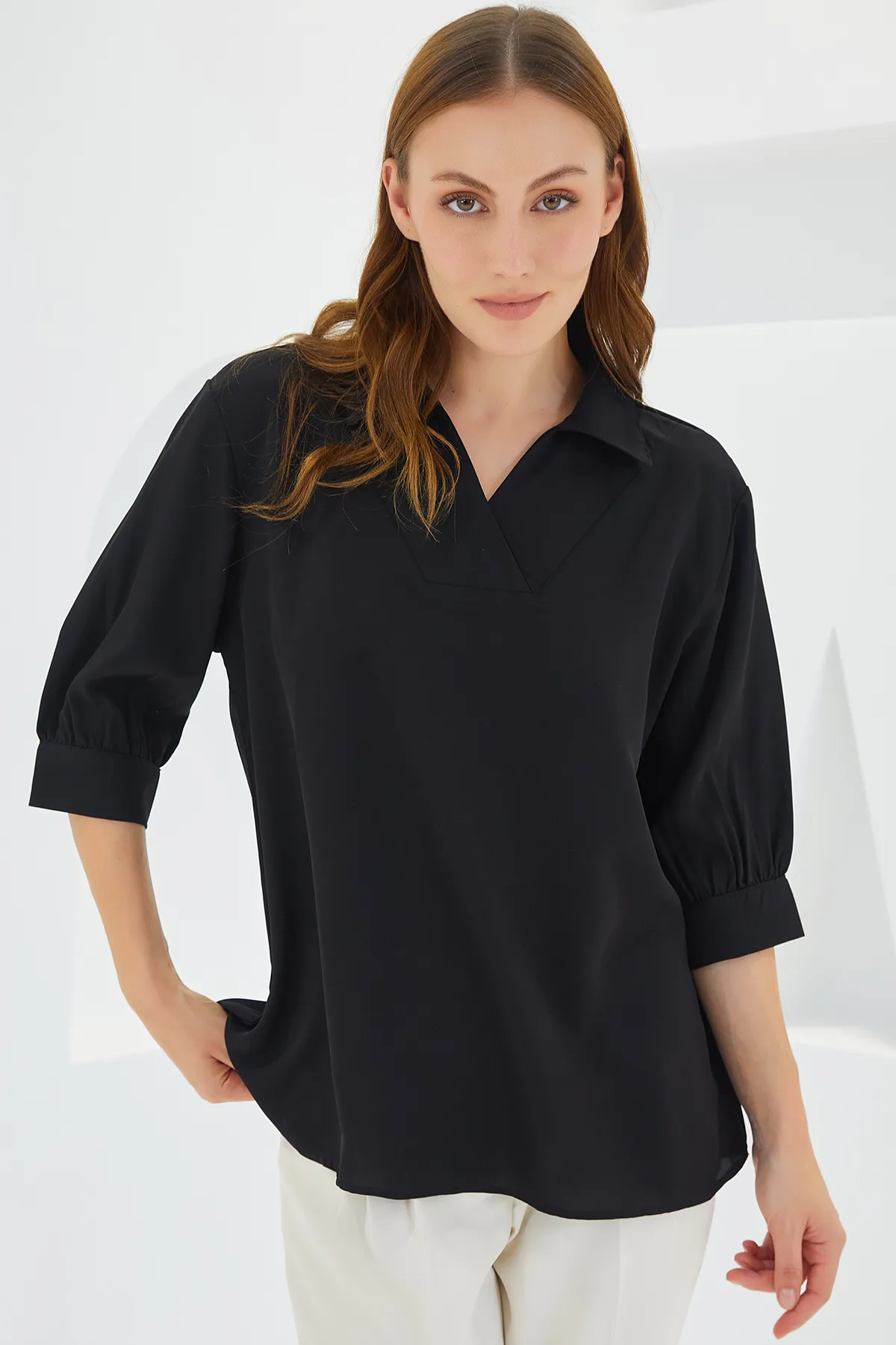 بلوزة بقصة محددة مع ياقة منسدلة وتفاصيل لامعة تمنحك ستايل شيك وانثوي لاطلالات يومية صيفية مريحة.