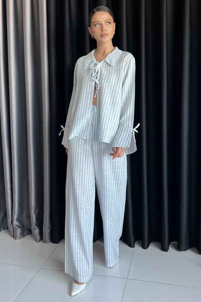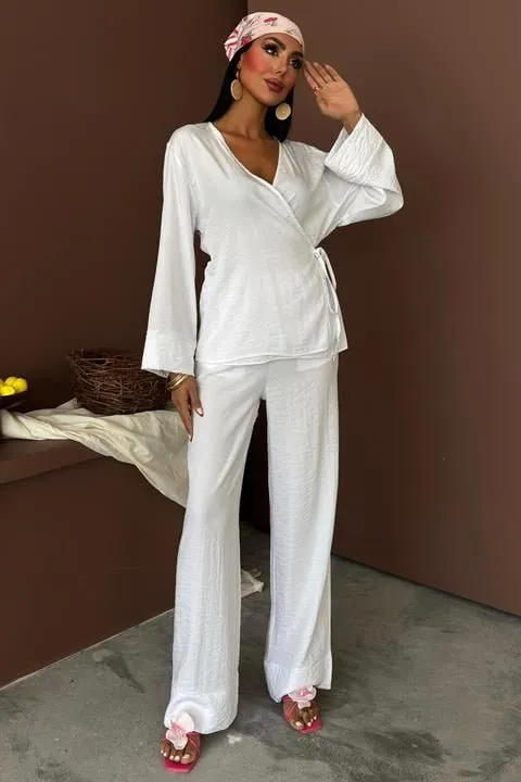 طقم نسائي مكوّن من قطعتين بأسلوب كيمونو يضم بلوزة وبنطلون مجعد متناسق، مصنوع من قماش ناعم وخفيف يوفر الراحة وسهولة الحركة. تصميمه المريح والعصري مثالي للاستخدام اليومي والإطلالات الموسمية.