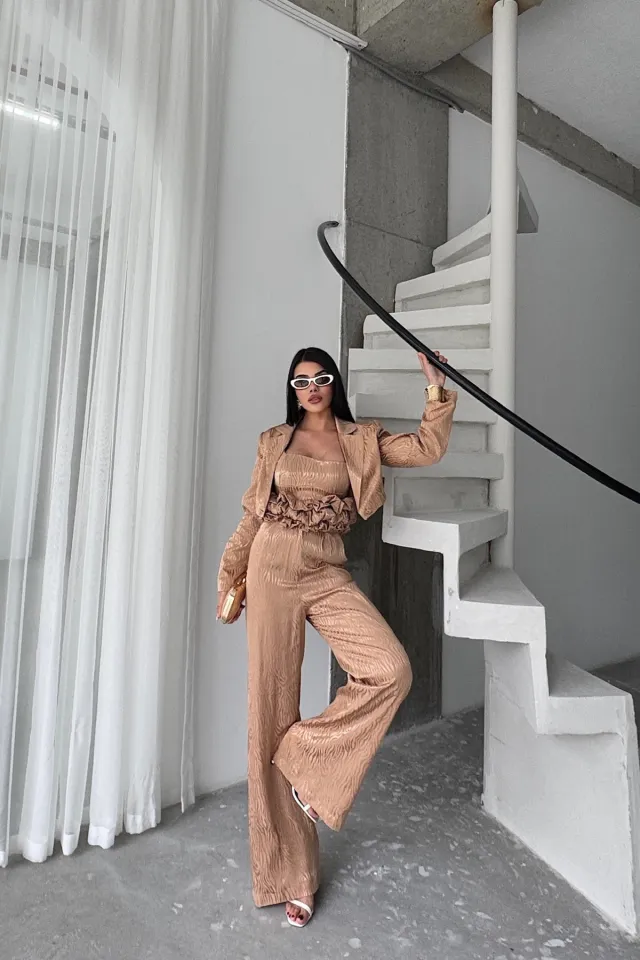 طقم نسائي مكوّن من قطعتين بأكمام طويلة يضم بلوزة بسحاب أمامي مع بنطلون متناسق بتفاصيل خطوط. مصنوع من قماش مودال ناعم وقابل للتنفس يوفر راحة ومرونة طوال اليوم. تصميم عصري وعملي مثالي للإطلالات الكاجوال والراحة اليومية.