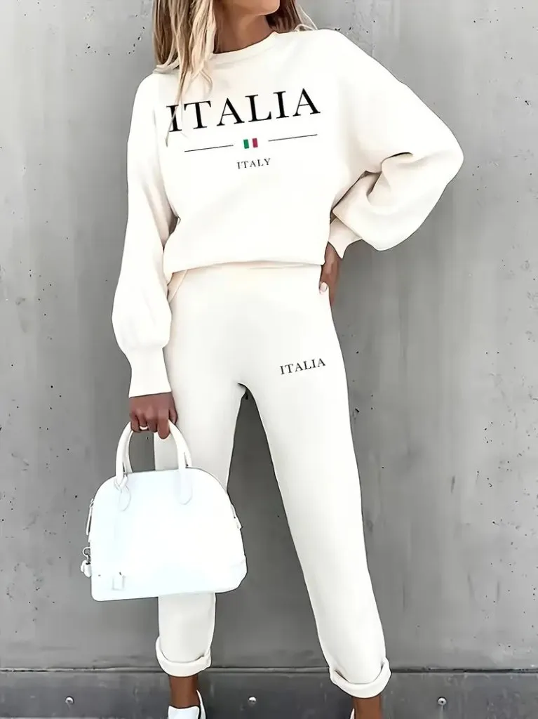 طقم بنطلون محبوك بأكمام طويلة و ياقة دائرية للنساء