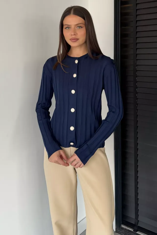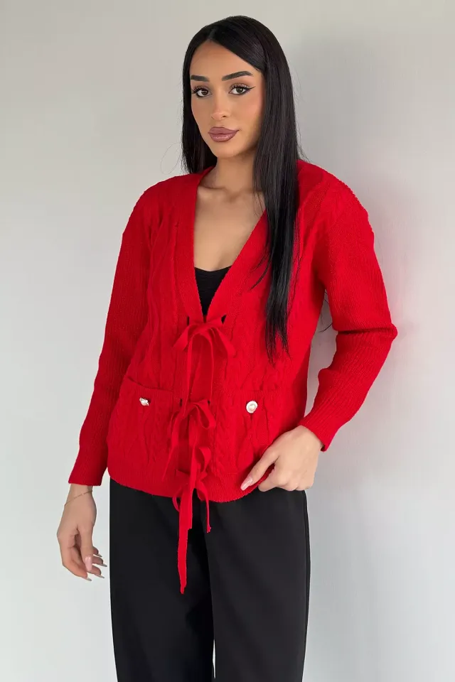 كارديغان نسائي بياقة دائرية بتصميم مخرم ونسيج تريكو يعطي لوك عصري مريح يناسب تنسيقات يومية موسمية.