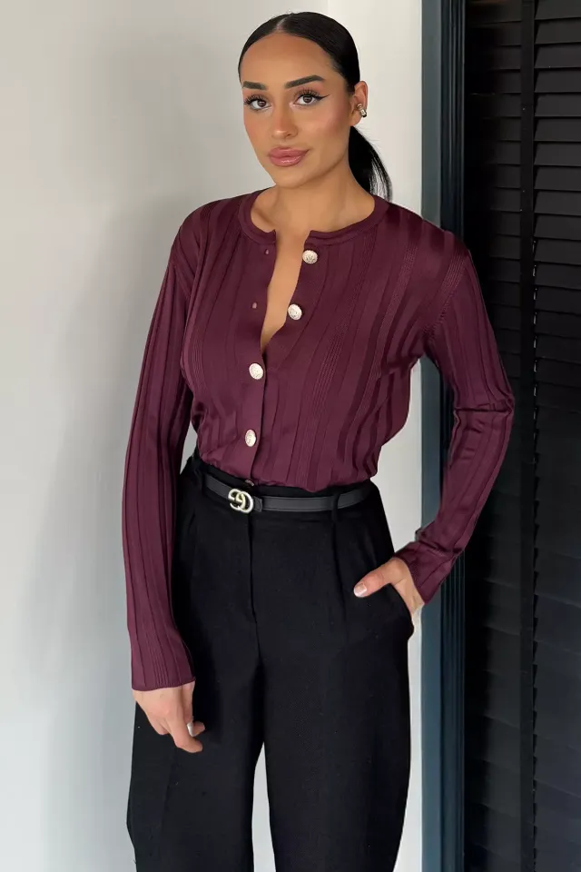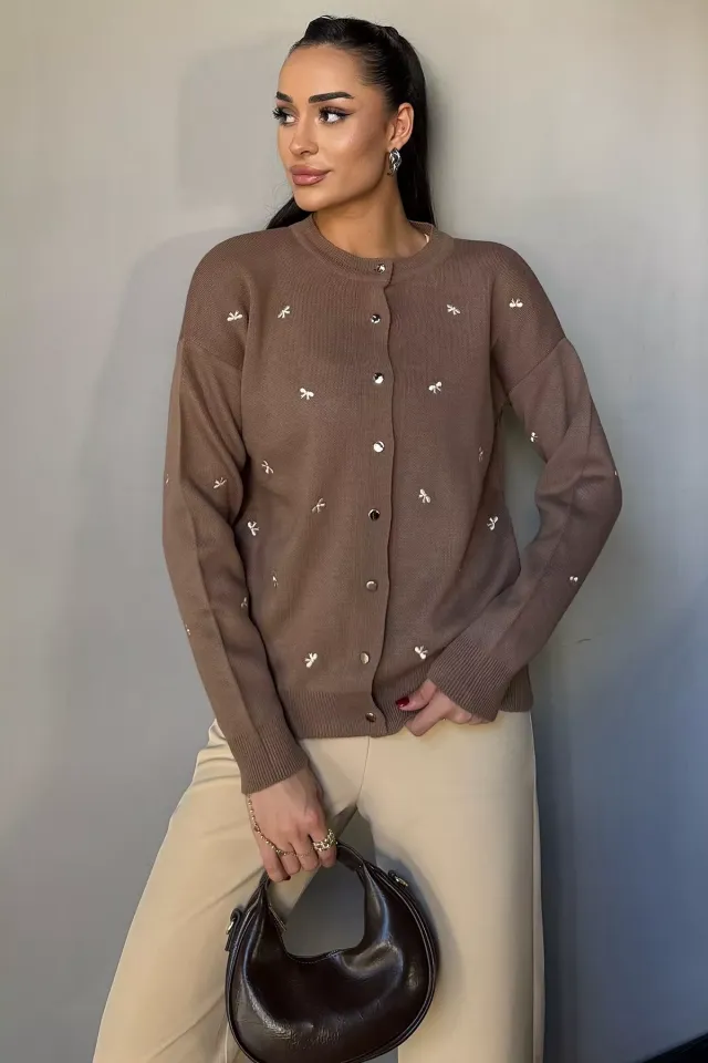 كارديغان نسائي بياقة دائرية بتصميم مخرم ونسيج تريكو يعطي لوك عصري مريح يناسب تنسيقات يومية موسمية.