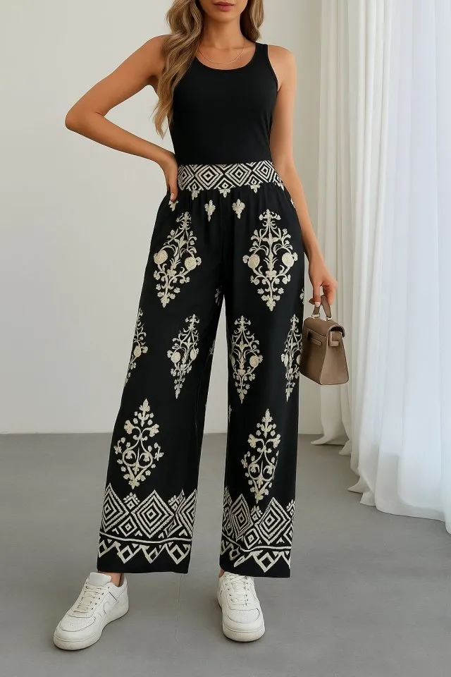 بنطلون بالازو بحزام خصر وتفاصيل بنس لستايل عصري كيوت ومناسب للوك يومي صيفي.