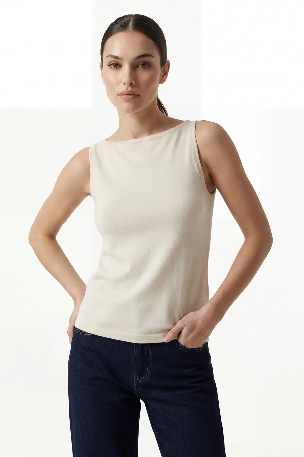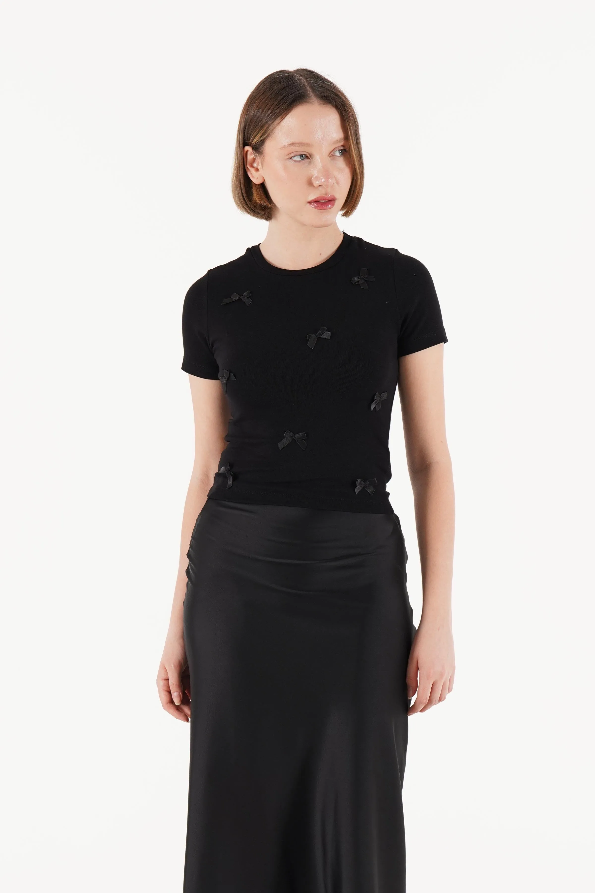 بودي بياقة دائرية بنسيج مضلع وقصة ضيقة يعطي لوك عصري مريح لإطلالات يومية صيفية شيك.