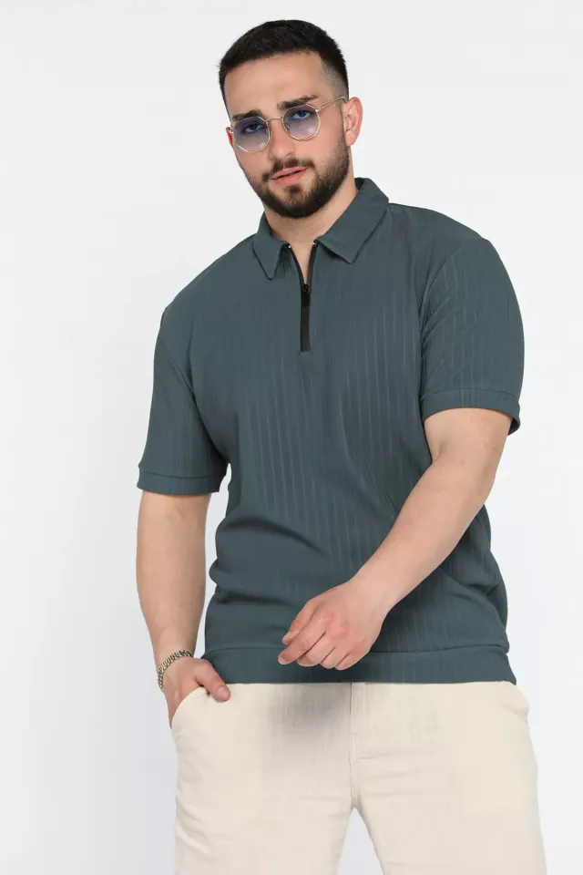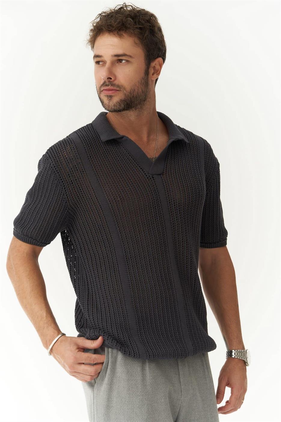 تيشيرت رجالي محبوك مخطط بأكمام قصيرة وقصة عادية وياقة دائرية - Beyond Store