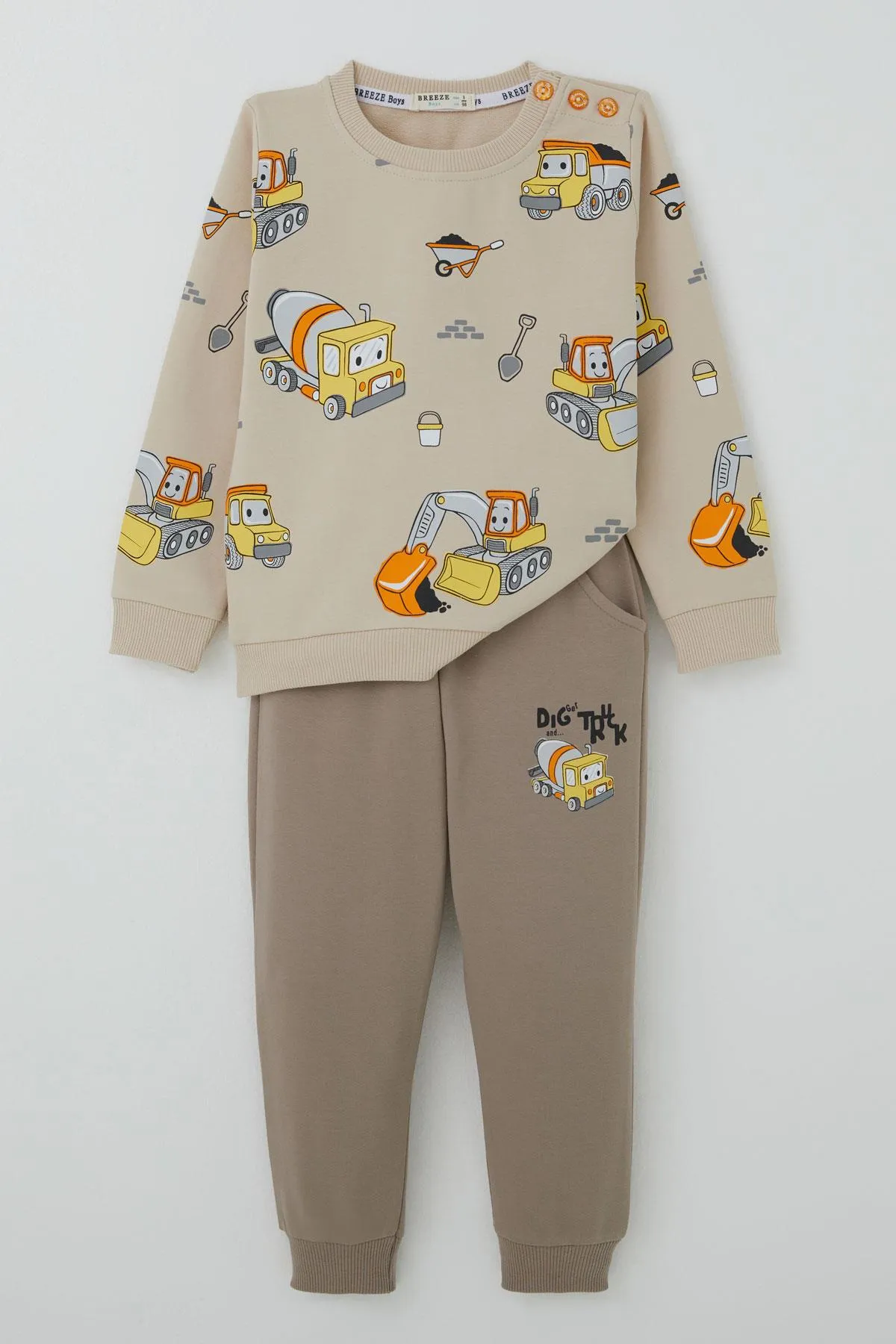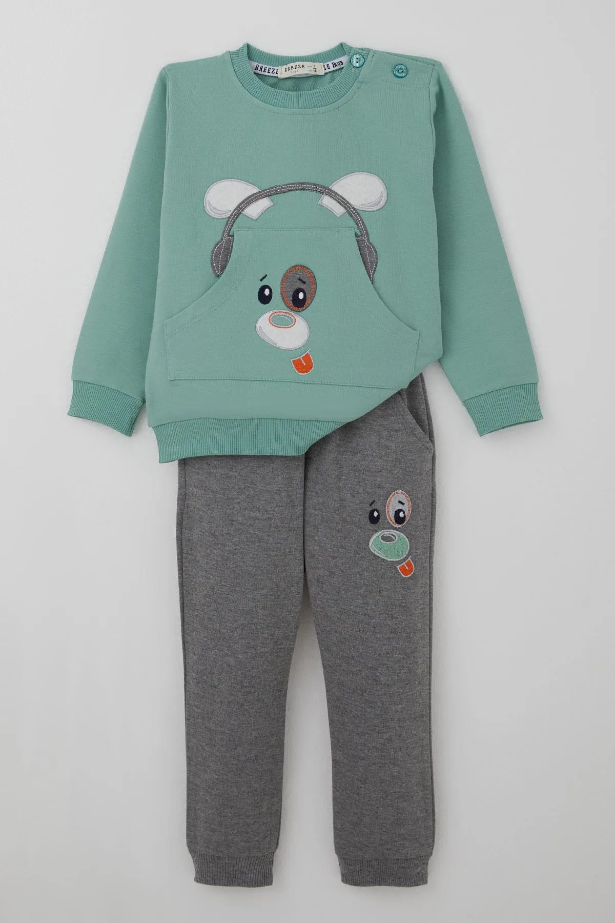 طقم رياضي ولادي مصنوع من القطن بنسبة 100% مع لمسة شاردون ناعمة لمنح راحة إضافية. مزود بغطاء رأس وجيب أمامي مع طبعة مرحة، يوفر إطلالة مريحة وعملية للارتداء اليومي أو اللعب أو الرياضة.