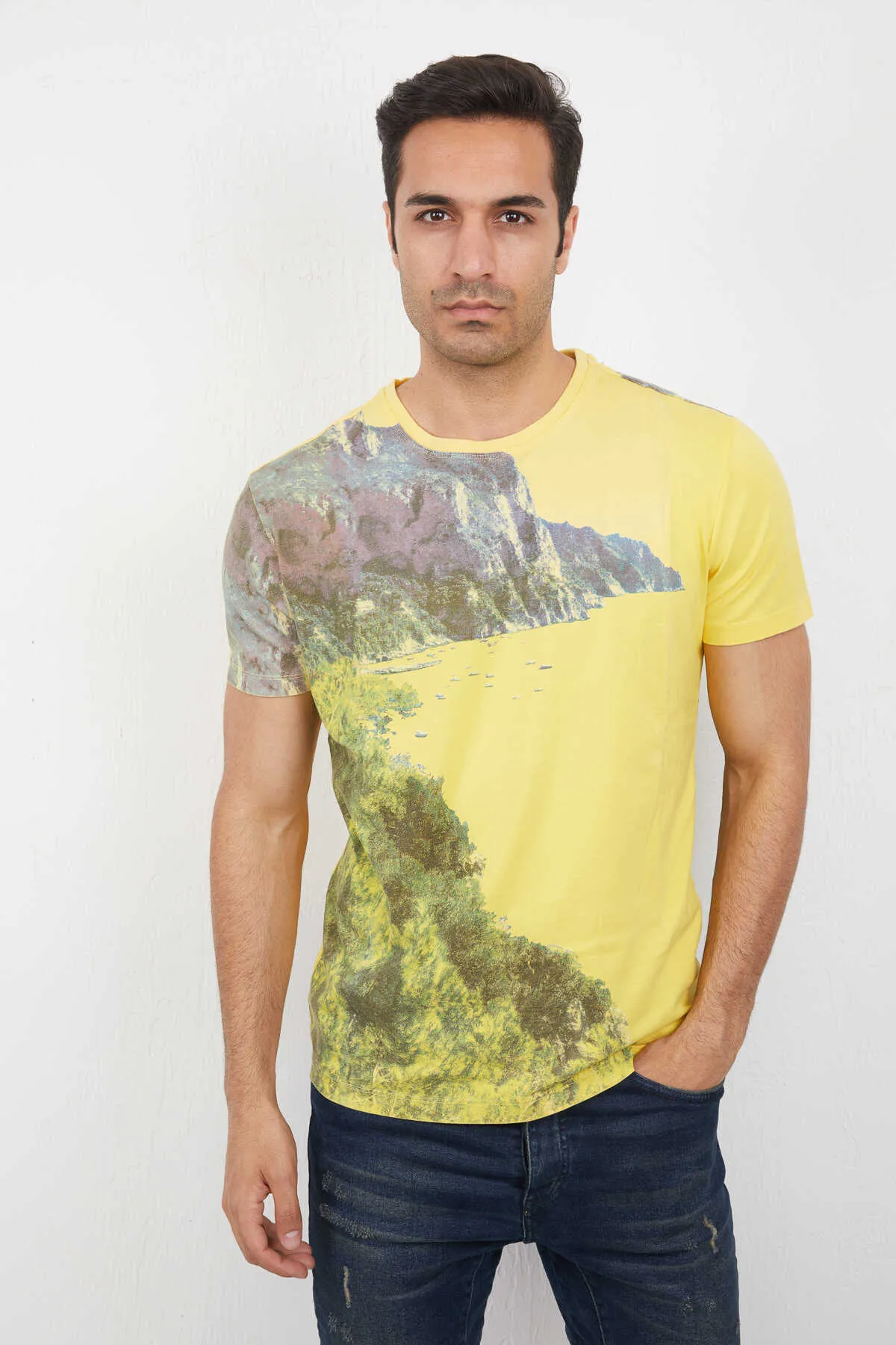 تيشيرت رجالي مضلع بأكمام قصيرة وقصة منتظمة مع ياقة دائرية - Beyond Store