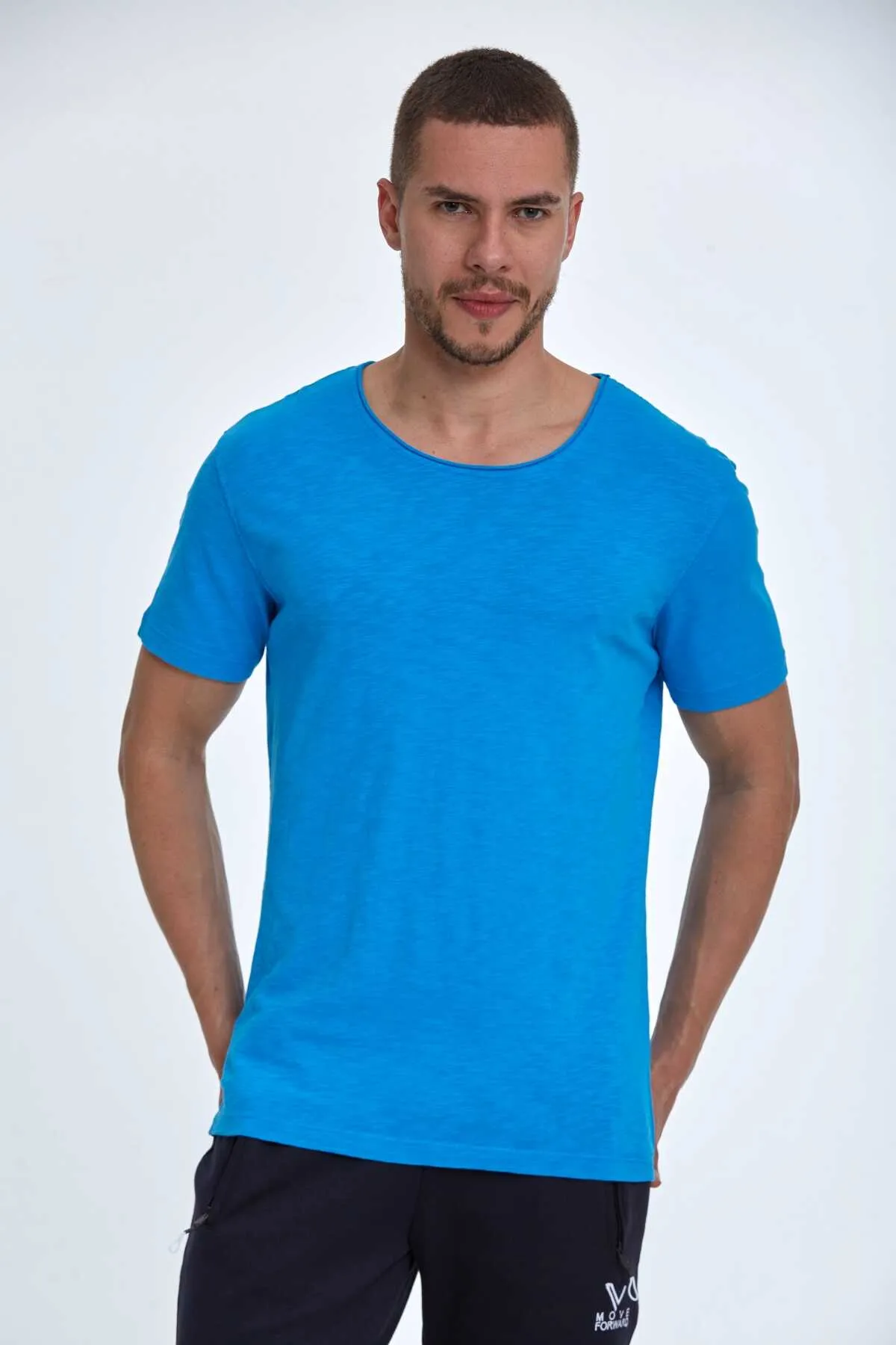 تيشيرت رجالي سادة بأكمام قصيرة وقصة واسعة، بتصميم أكتاف منسدلة وياقة دائرية. يتميز بتصميم عصري مريح، يسهل تنسيقه مع الملابس اليومية لإطلالة متوازنة.