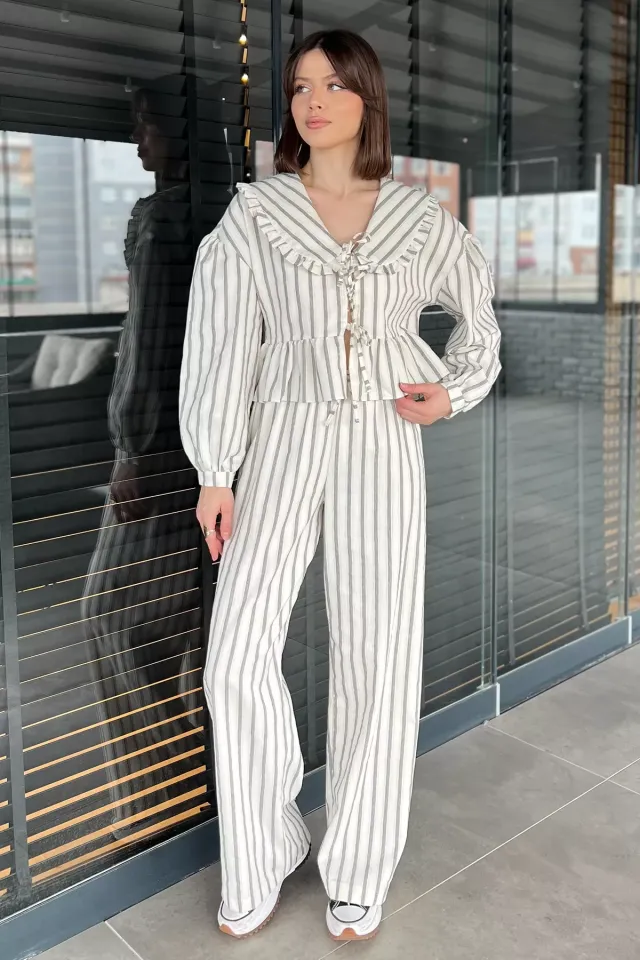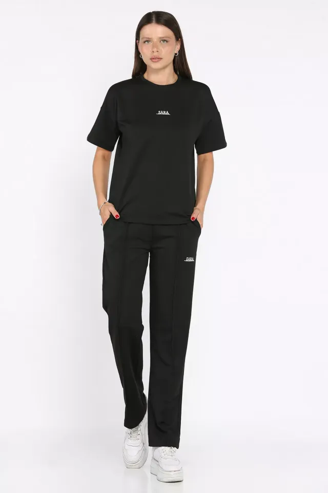 طقم صيفي مريح بتيشيرت ياقة دائرية كم قصير وبنطلون بخصر مرن مناسب للاستخدام اليومي.