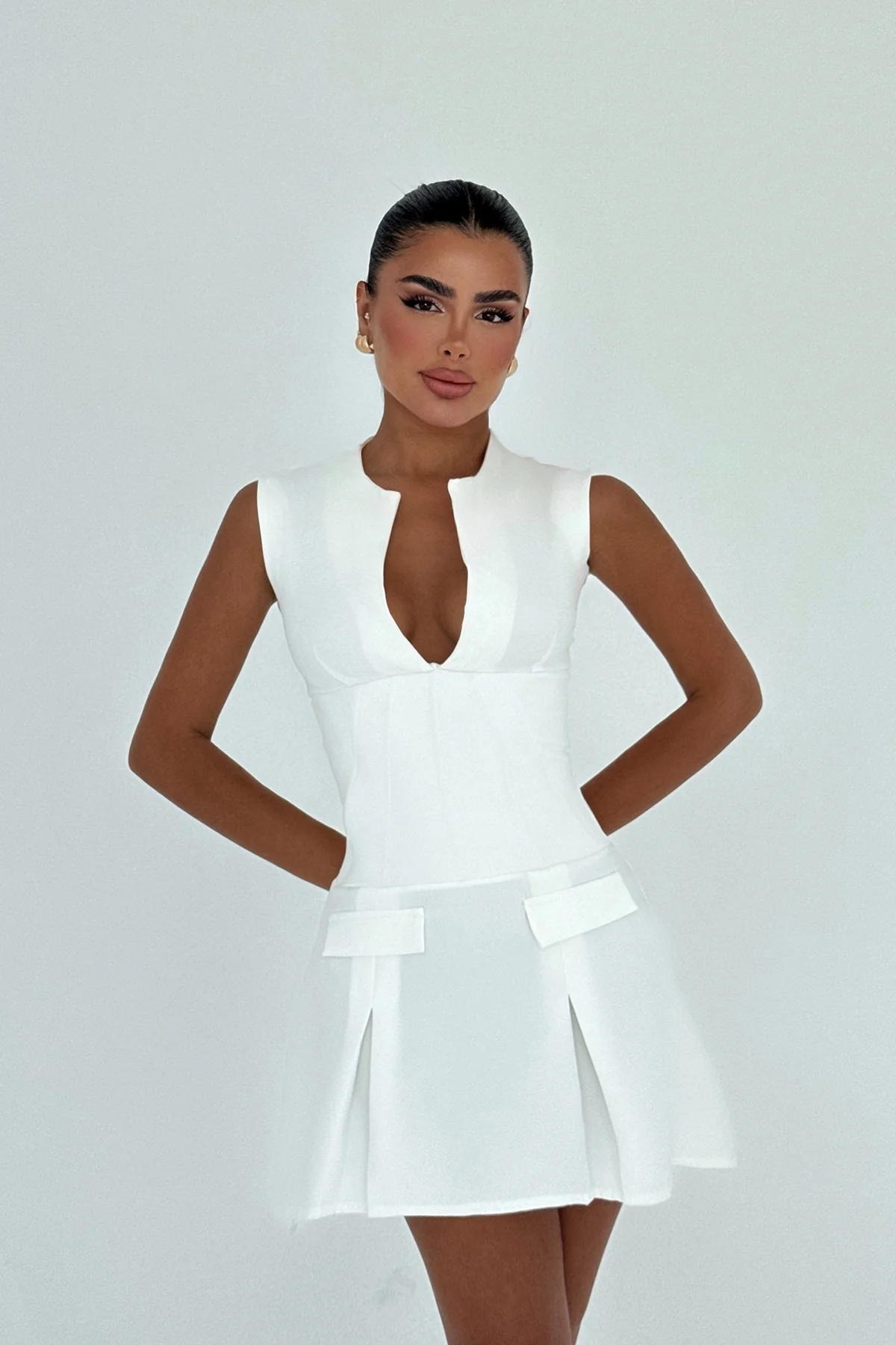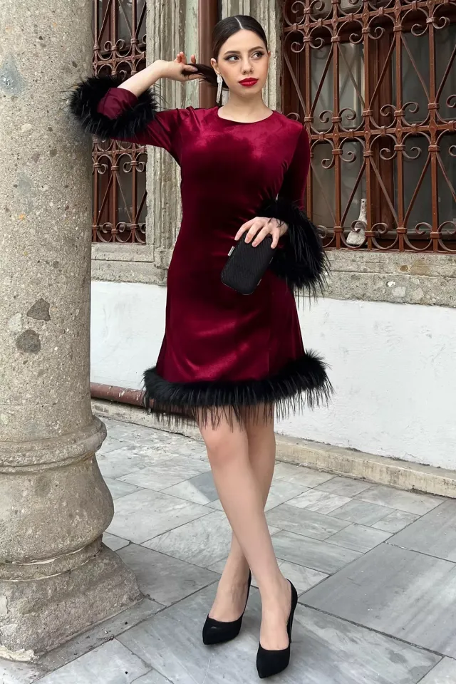 فستان نسائي قصير من الكريب بياقة دائرية وكم قصير مع كشكش امامي بقصة ضيقة يمنح اطلالة انيقة.