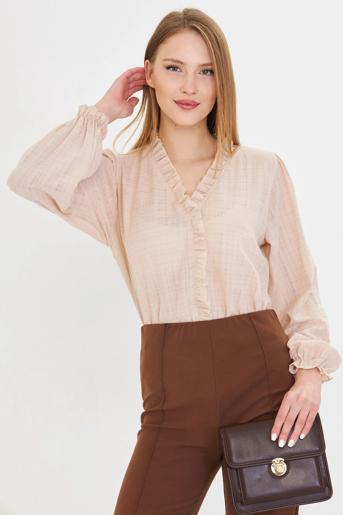 بلوزة مضلعة بكم طويل مع فتحة عند الصدر وتفصيل إبزيم تمنح اطلالة يومية عصرية بقصة ضيقة.
