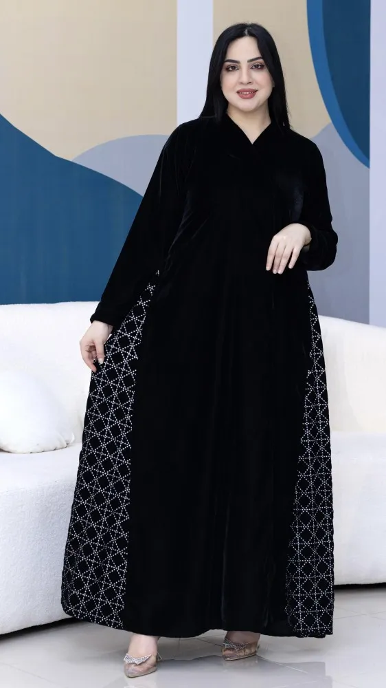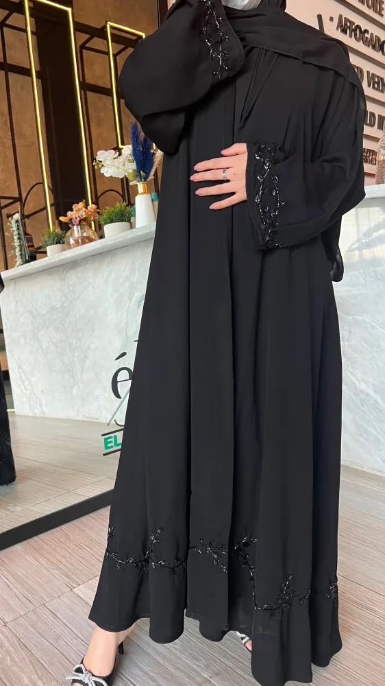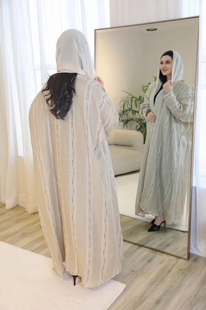 عباية فاخرة مصنوعة من قماش الكريب السيراميك الراقي، تتميز بياقة عصرية مع حزام أنيق يبرز جمال القصة. الملمس الناعم مع التصميم المرتب يمنح اطلالة راقية ومتوازنة، مما يجعلها مناسبة للمناسبات الرسمية والعمل والجمعات الانيقة.