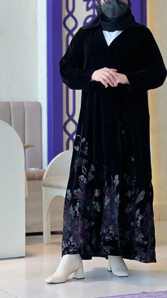 عباية طويلة أنيقة بتطريزات أمامية وعلى الأكمام