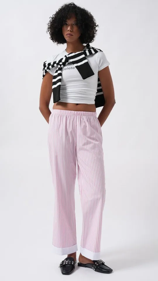 بنطلون تريند بقصة واسعة من الأسفل مع قماش مطاطي وخصر مطاطي وتفاصيل حجر تعطيك لوك جريء وأنيق.