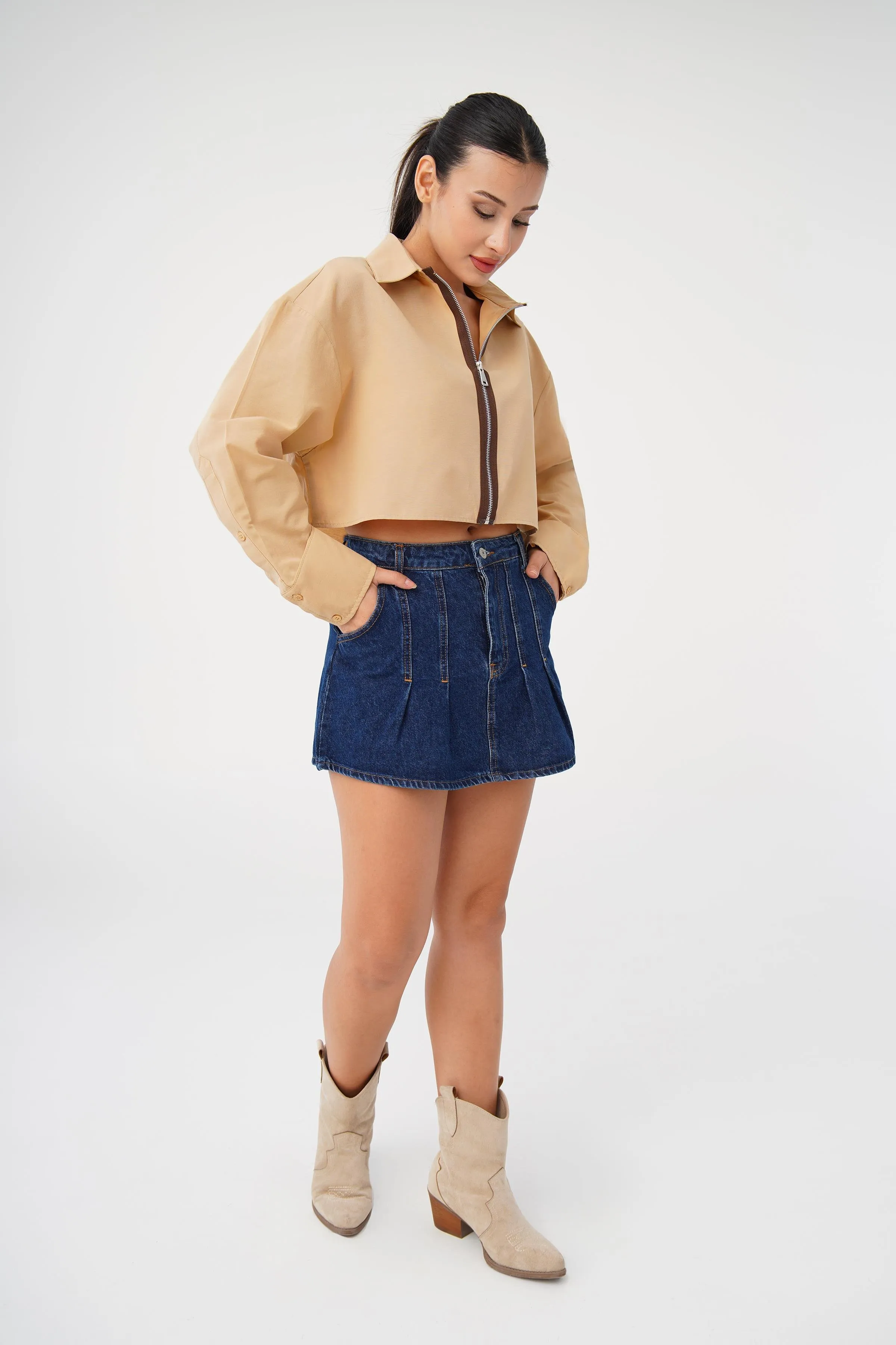الموديل ترتدي مقاس S – الطول 172 سم، الوزن 65 كغ، الصدر 85 سم، الخصر 66 سم، الورك 93 سم