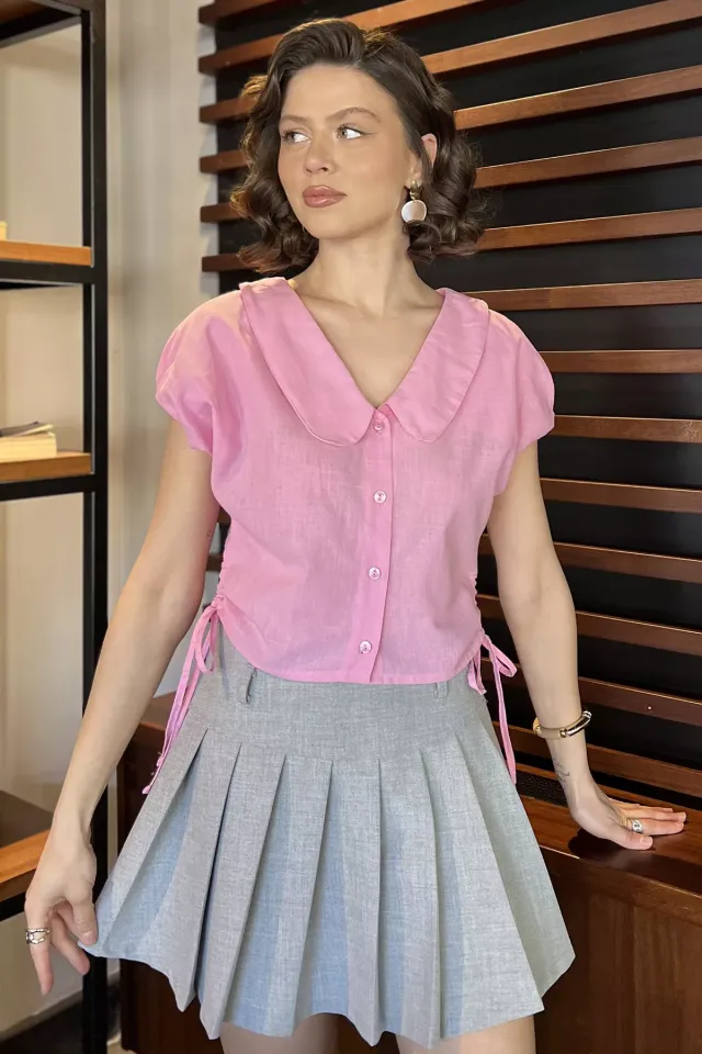 قميص بكم طويل وياقة قميص مع تفصيل ربطة جانبية يمنحك ستايل عصري مريح لاطلالات يومية صيفية سهلة التنسيق.