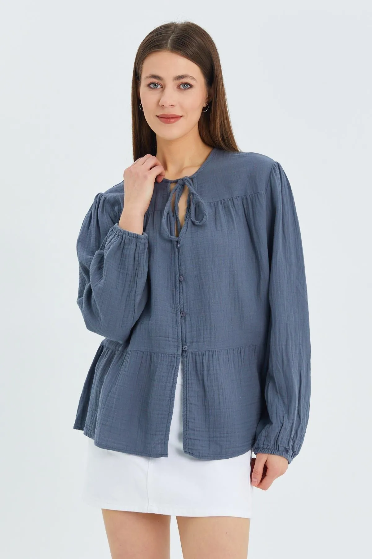 قميص نسائي بقصة محددة مع كم طويل وياقة قميص يمنحك ستايل عصري مريح لاطلالات يومية شيك.
