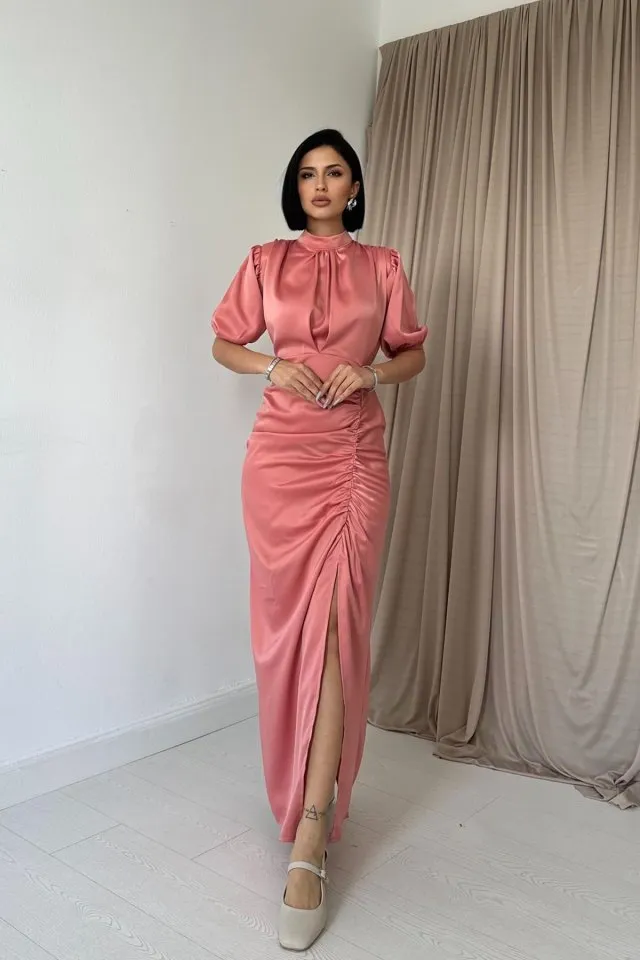 فستان ميدي بياقة V مع تفاصيل دانتيل وتفاصيل مجمعة يمنحك اطلالة انيقة عصرية للصيف.