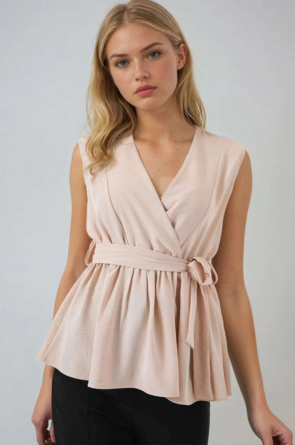 بلوزة بحمالة رفيعة وياقة V بقماش بمظهر الكتان للنساء - Beyond Store