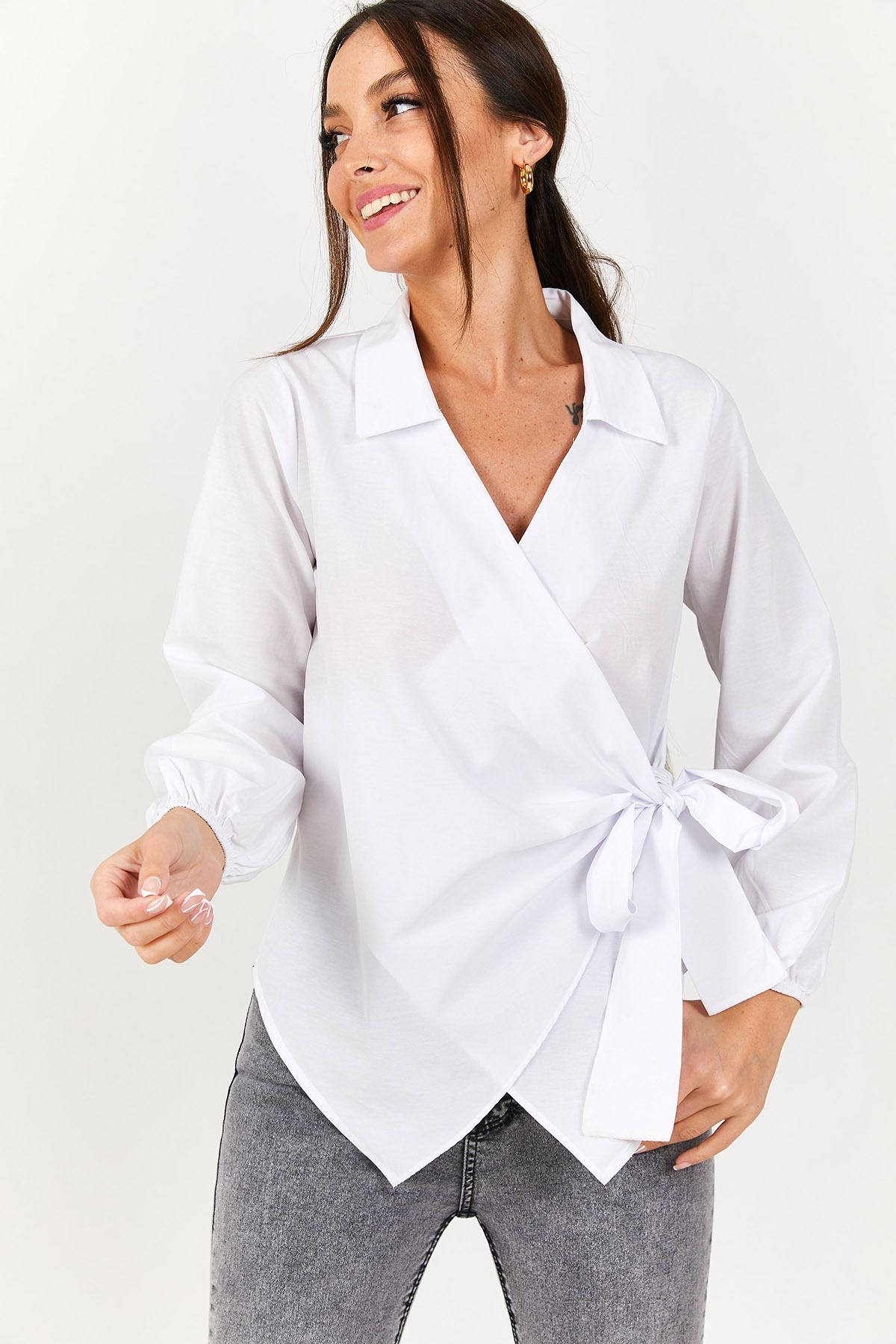 بلوزة اوفرسايز بياقة V مع شقوق جانبية وظهر اطول تعطي لوك عصري مريح مناسب للاطلالات اليومية.