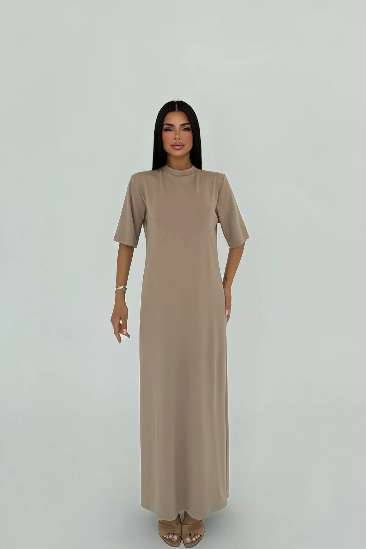 فستان ميدي بنسيج محبوك ناعم وياقة دائرية وقصة كتف منخفضة بقصة مريحة لستايل يومي مريح وأنيق.