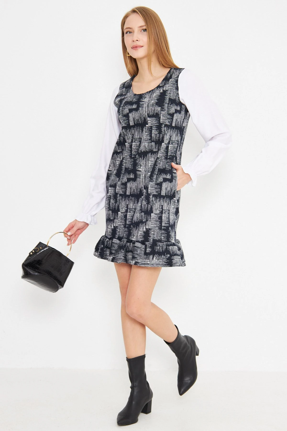 الموديل ترتدي مقاس S – الطول 175 سم، الصدر 85 سم، الخصر 62 سم، الورك 91 سم