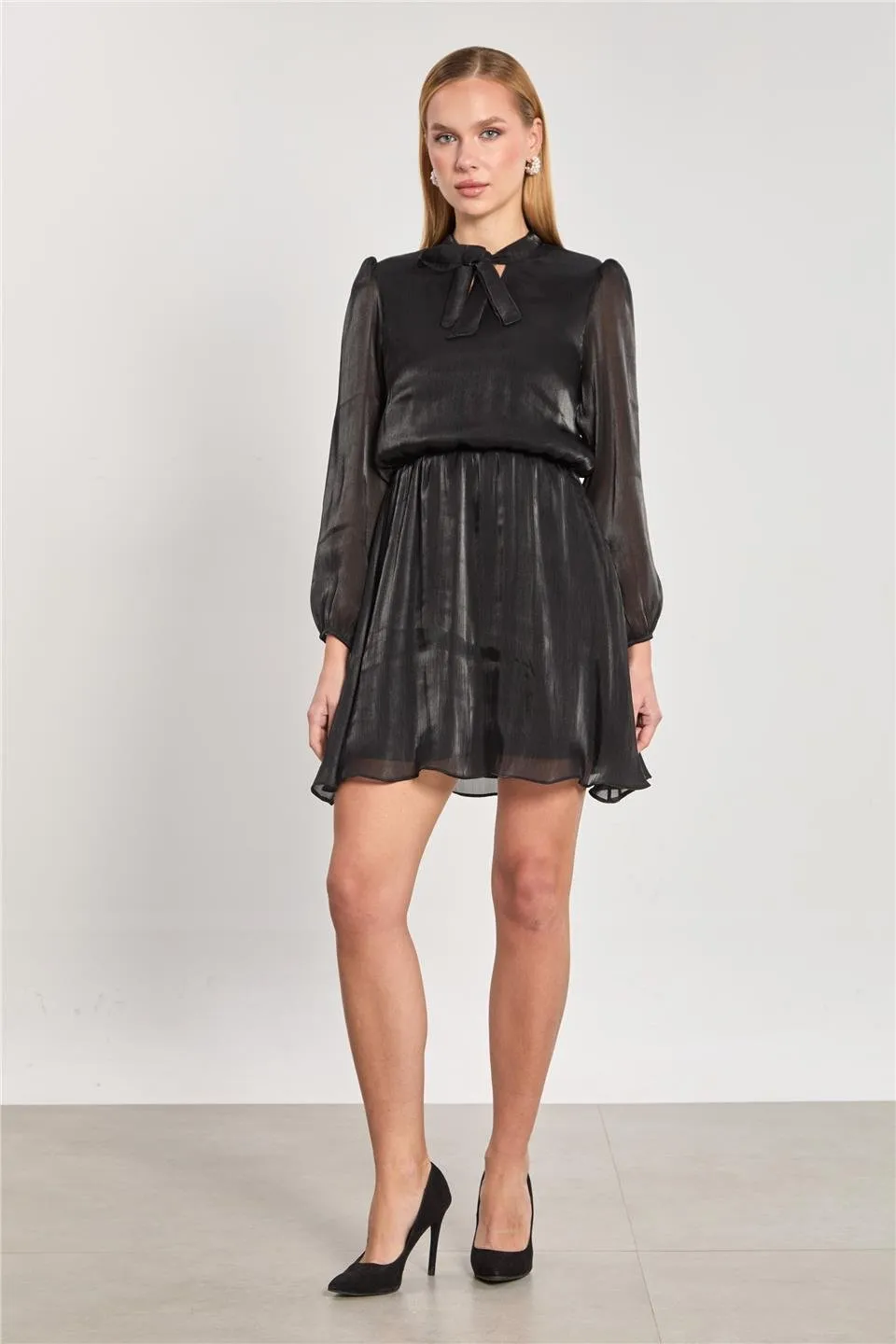 فستان قصير بياقة V وخصر مرن بقصة كلوش مع حجم خفيف في الأكمام يعطي ستايل مرتب ومناسب للاستخدام اليومي.