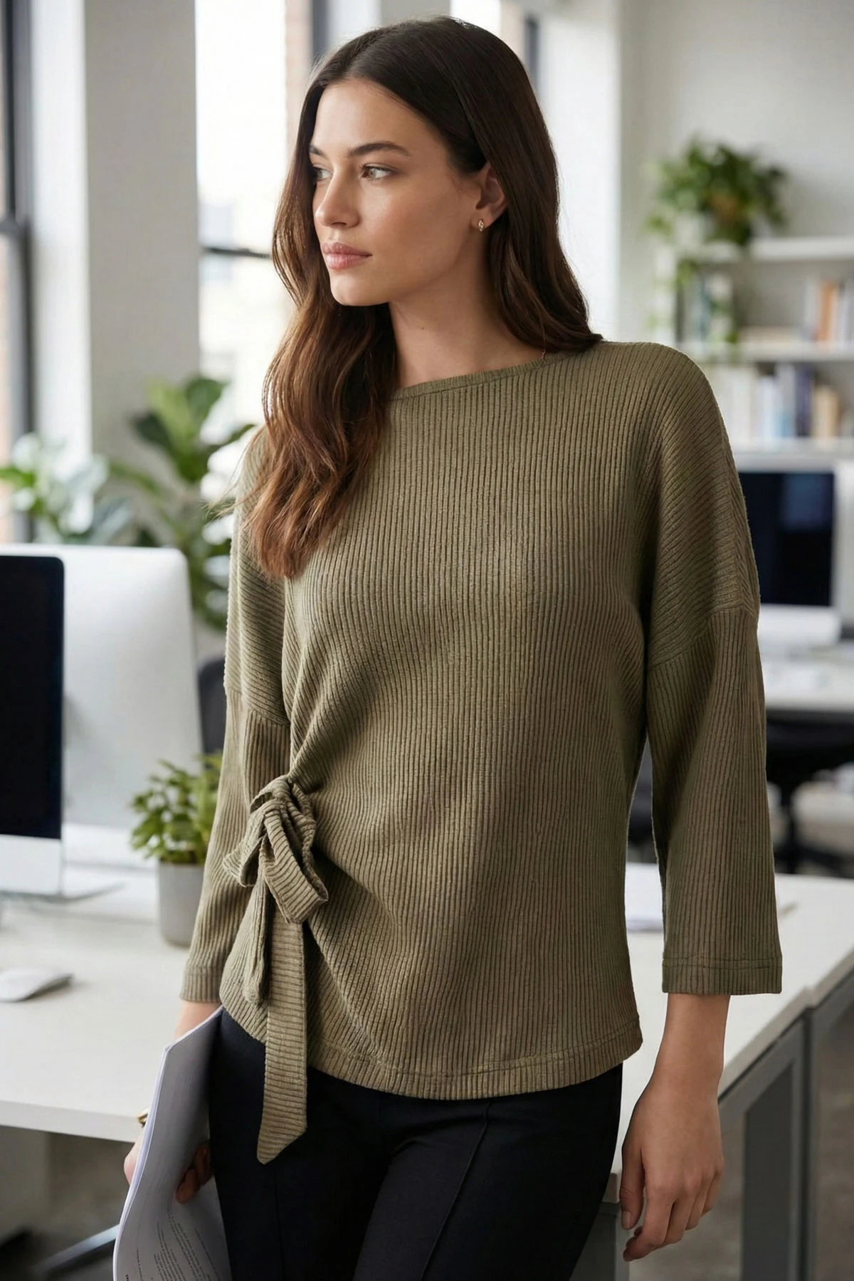 بلوزة مريحة بياقة V واكمام كشكش تعطي لوك كيوت وناعم بستايل عصري مناسب للاطلالات اليومية الصيفية.